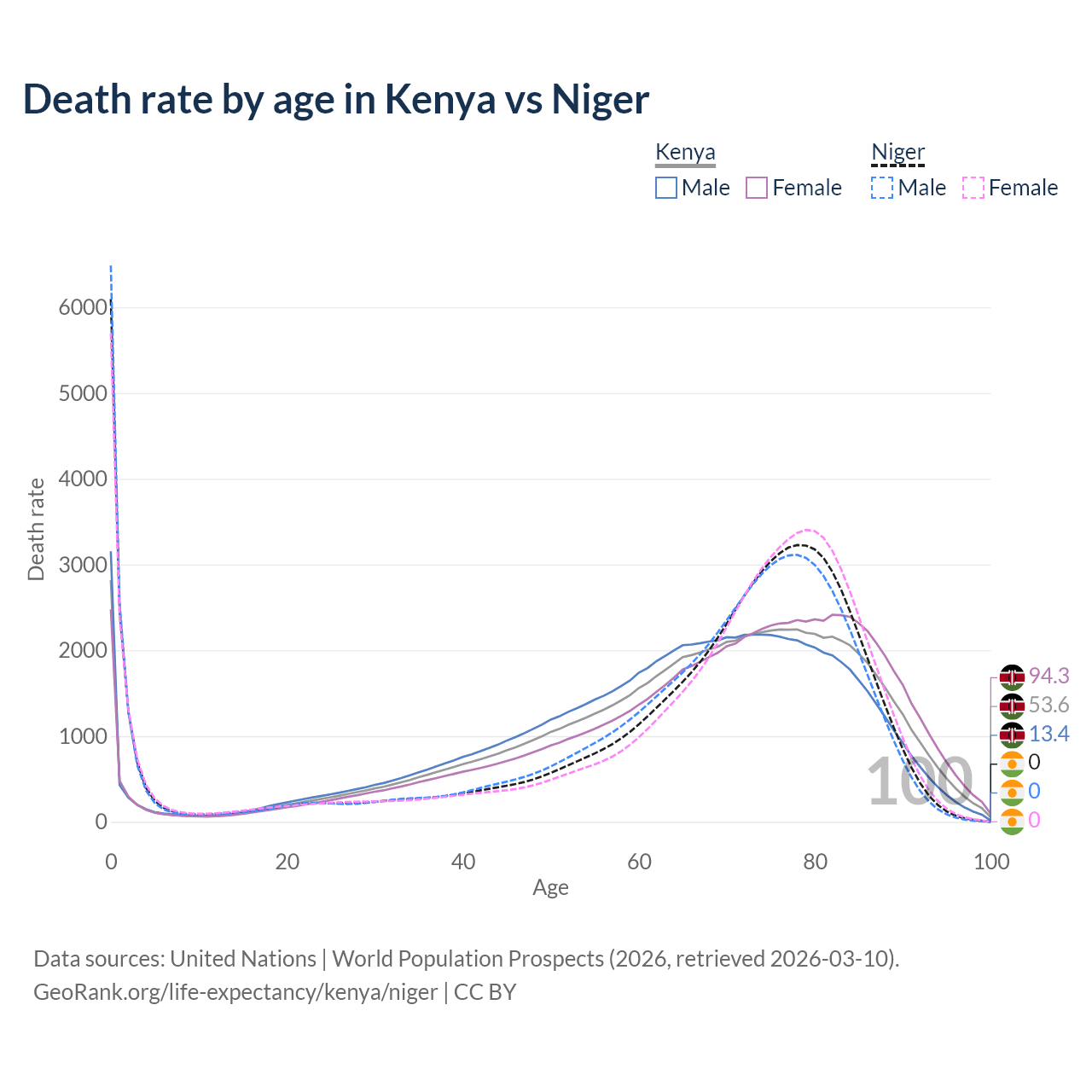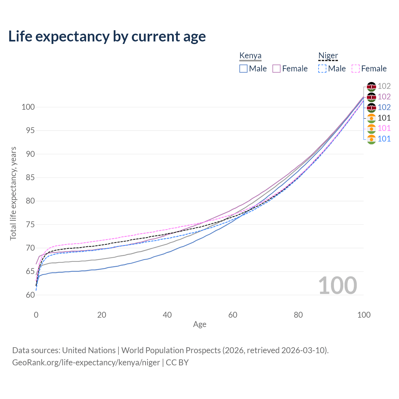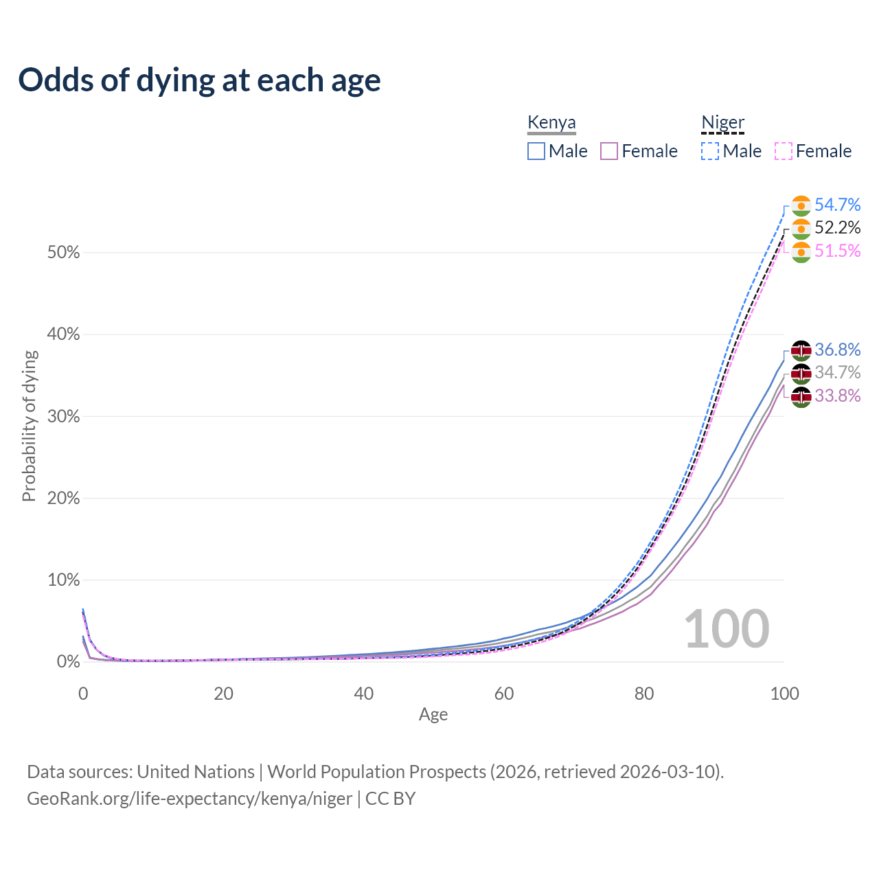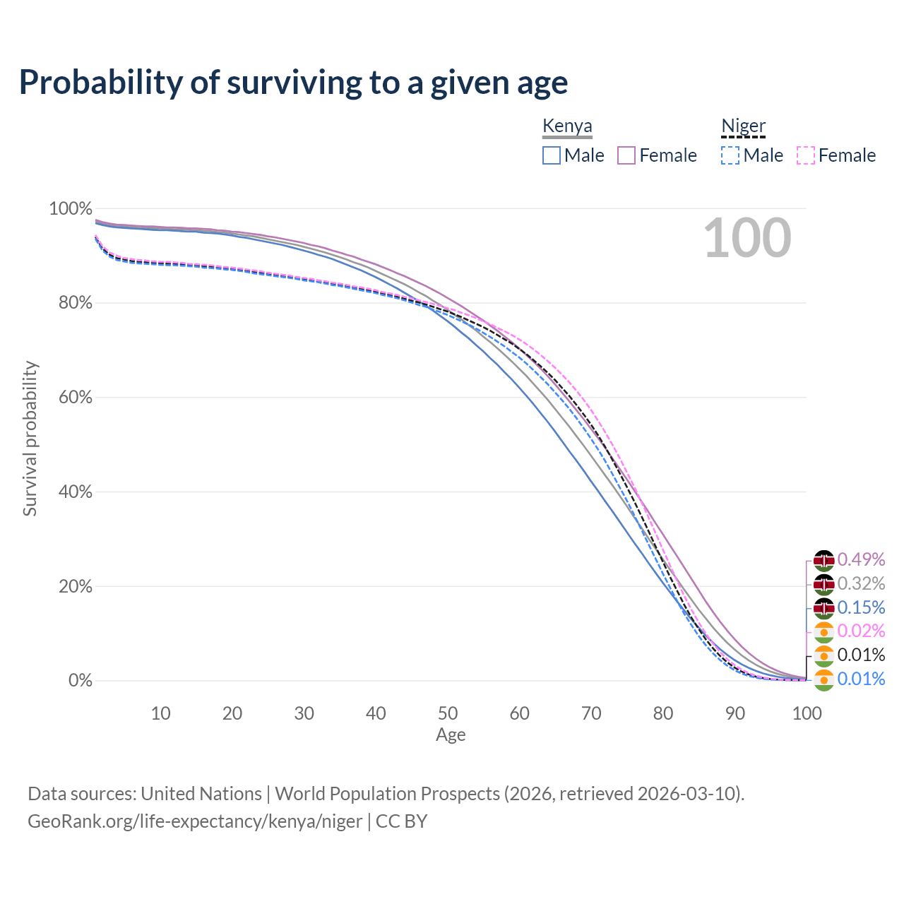 This life expectancy calculator shows the odds of living to 100, 95, 90, and below based on current age for both males and females in Kenya and Niger, along with mean and median age of death. The calculations are based on the 2026 life tables (actuarial tables) from the UN World Population Prospects.