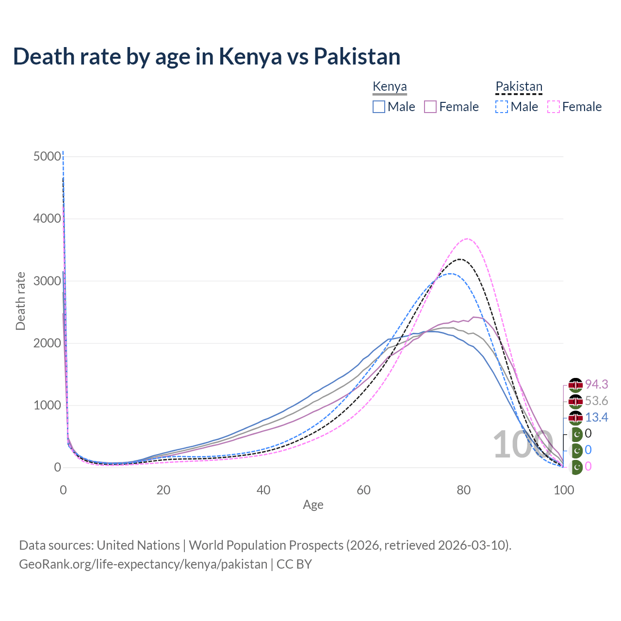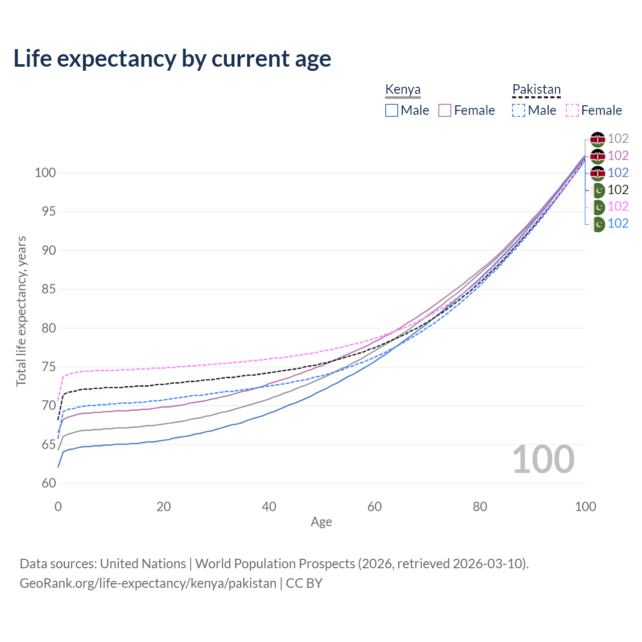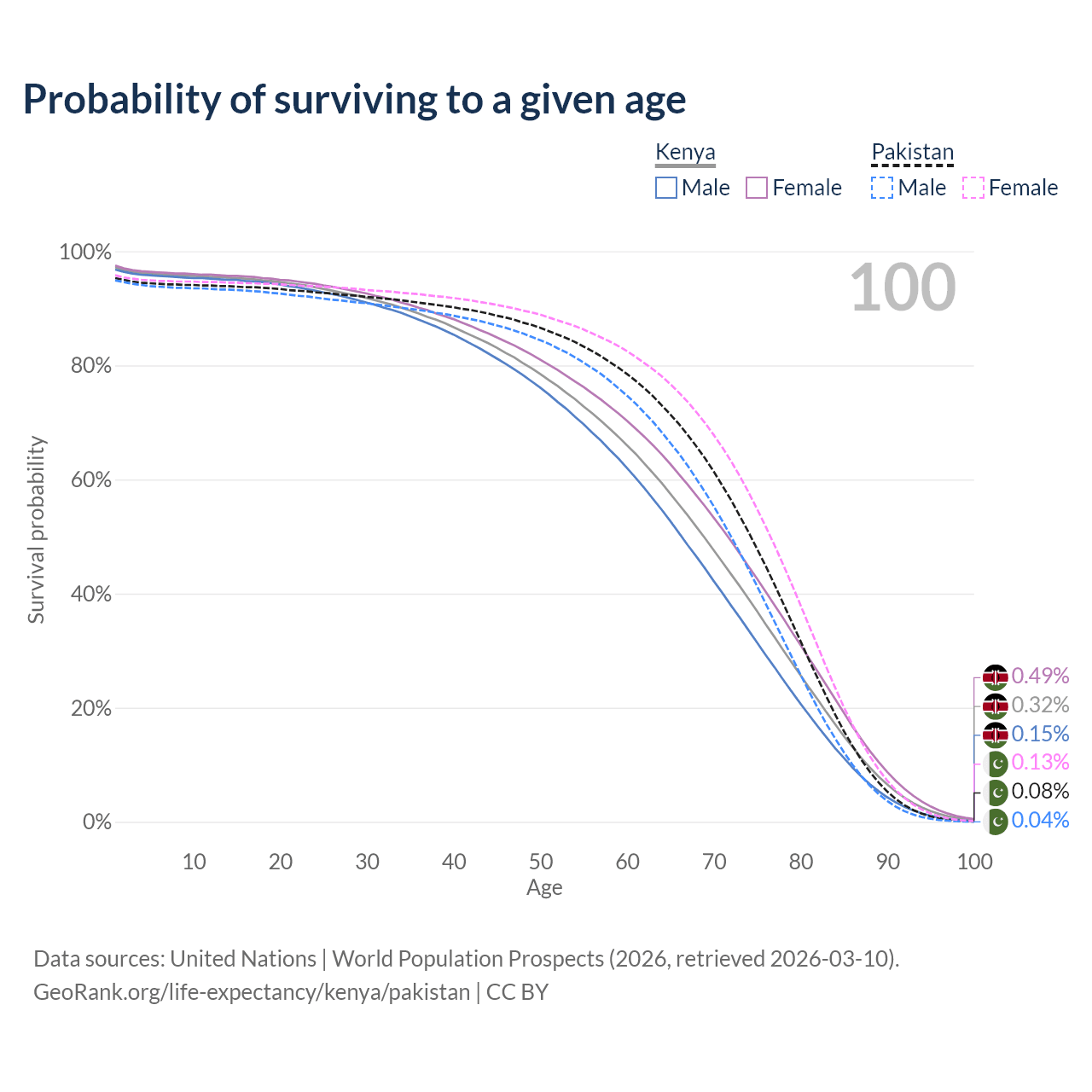 This life expectancy calculator shows the odds of living to 100, 95, 90, and below based on current age for both males and females in Kenya and Pakistan, along with mean and median age of death. The calculations are based on the 2026 life tables (actuarial tables) from the UN World Population Prospects.