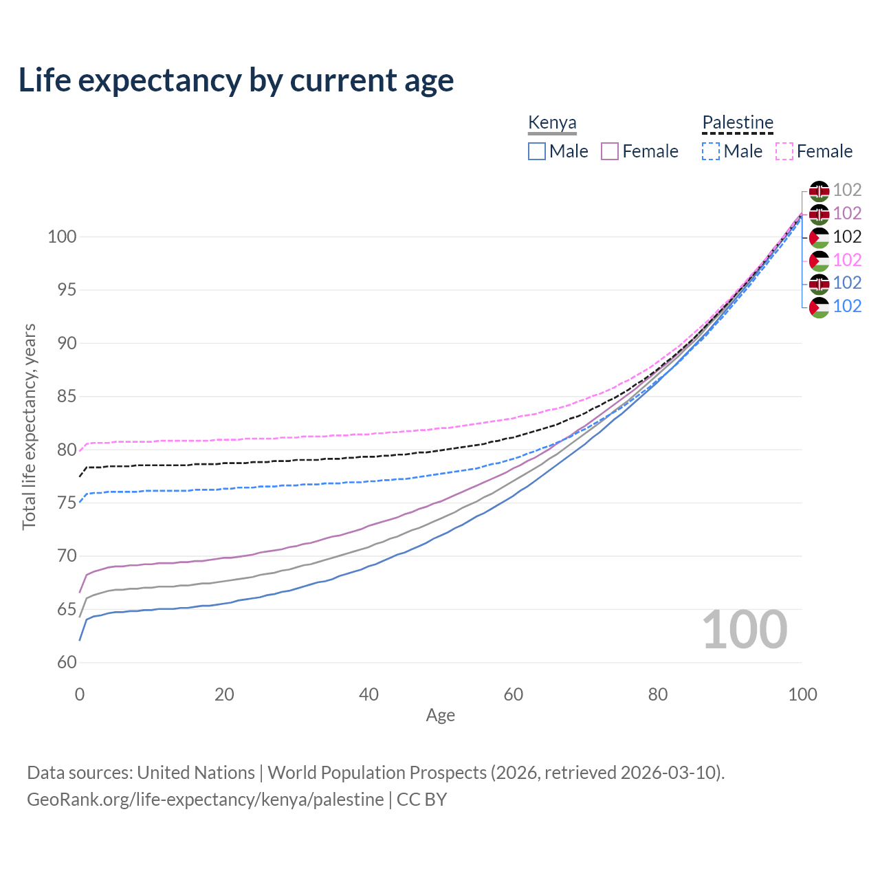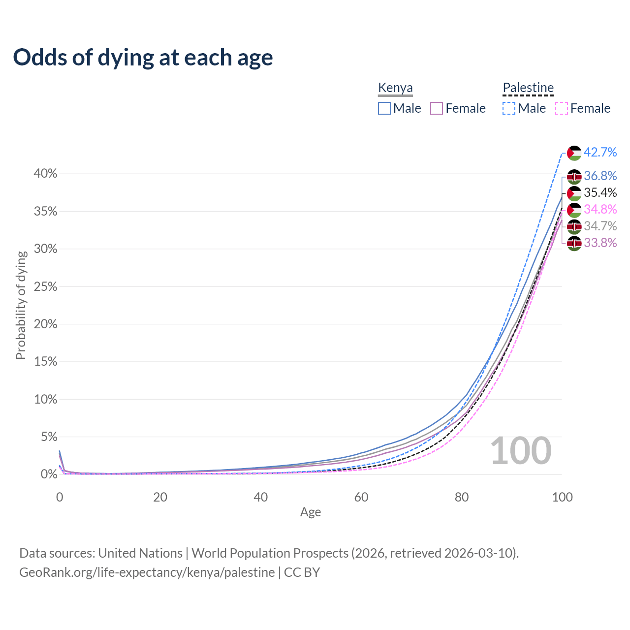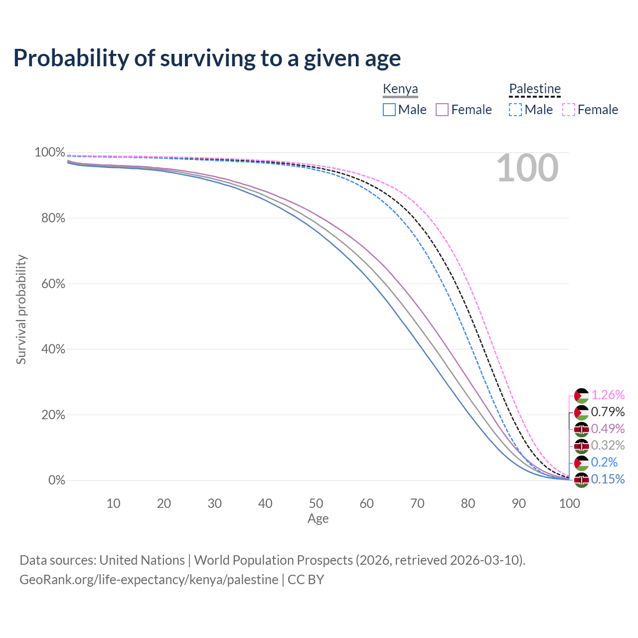 This life expectancy calculator shows the odds of living to 100, 95, 90, and below based on current age for both males and females in Kenya and Palestine, along with mean and median age of death. The calculations are based on the 2026 life tables (actuarial tables) from the UN World Population Prospects.