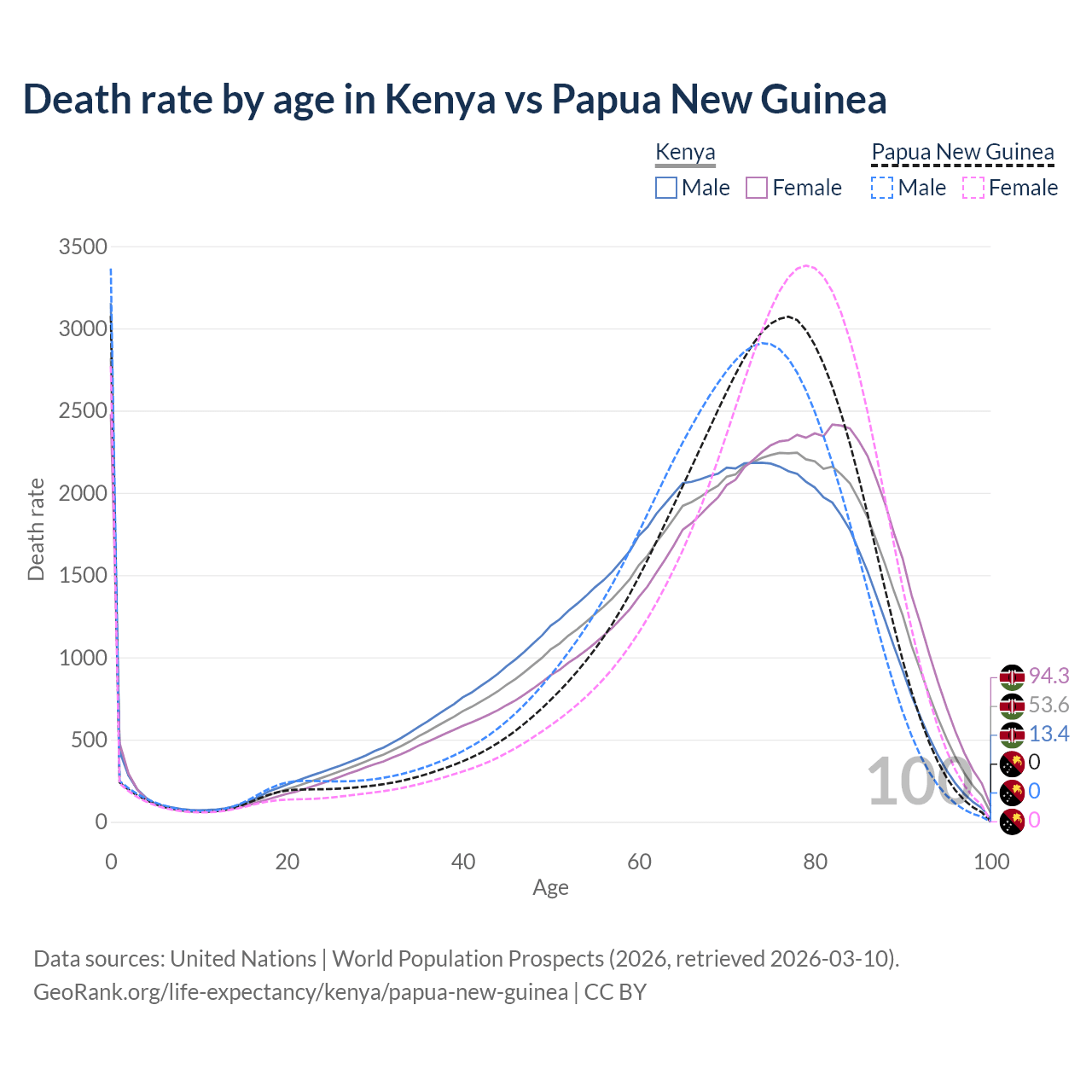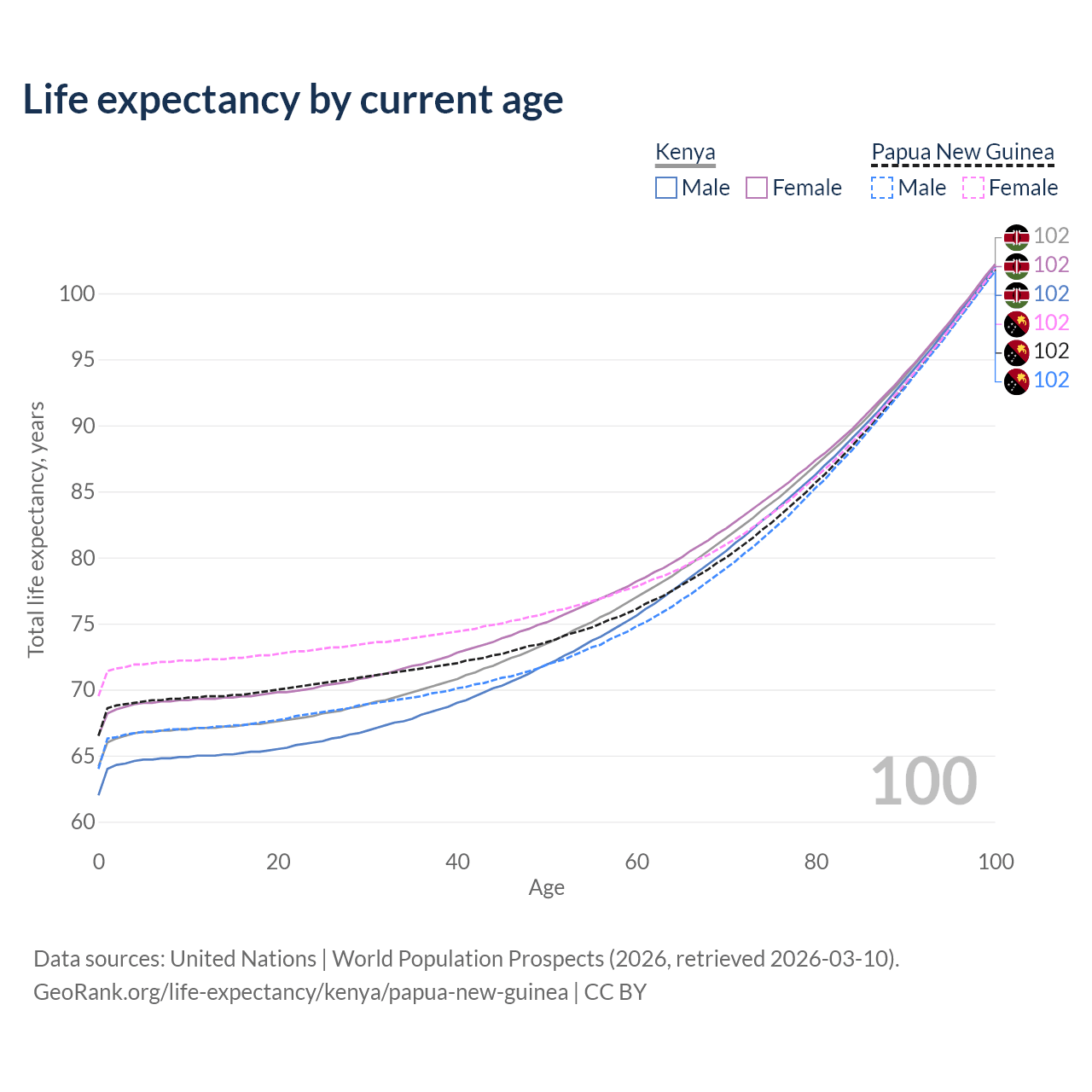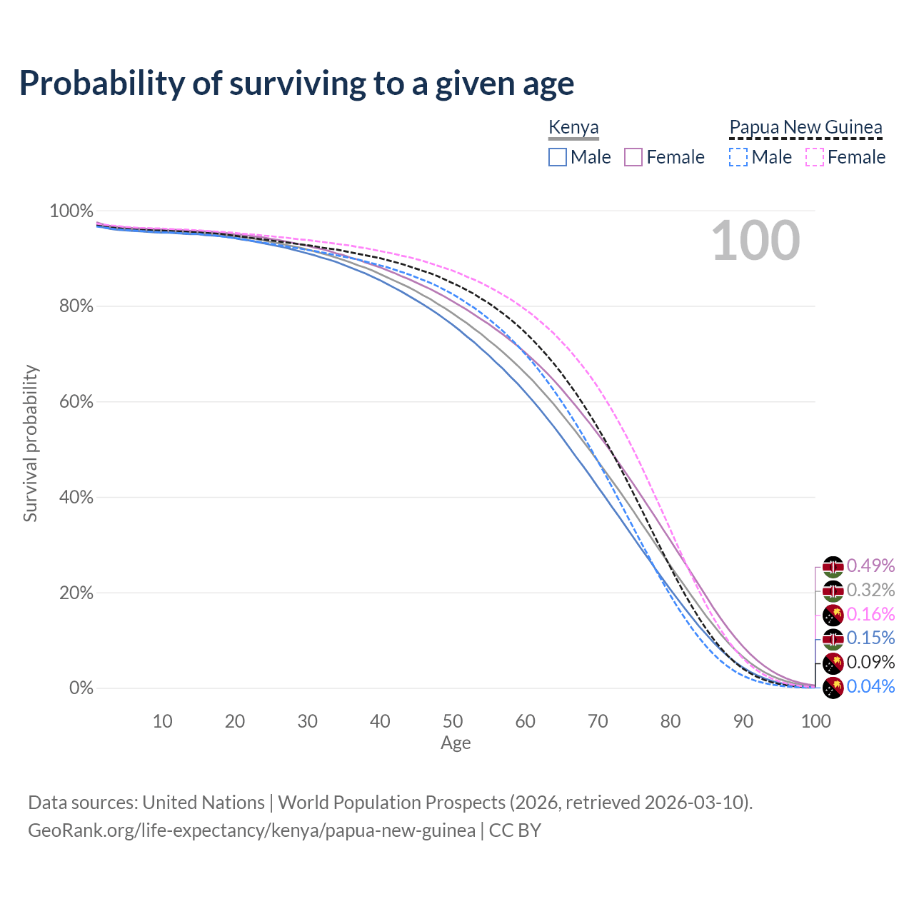 This life expectancy calculator shows the odds of living to 100, 95, 90, and below based on current age for both males and females in Kenya and Papua New Guinea, along with mean and median age of death. The calculations are based on the 2026 life tables (actuarial tables) from the UN World Population Prospects.