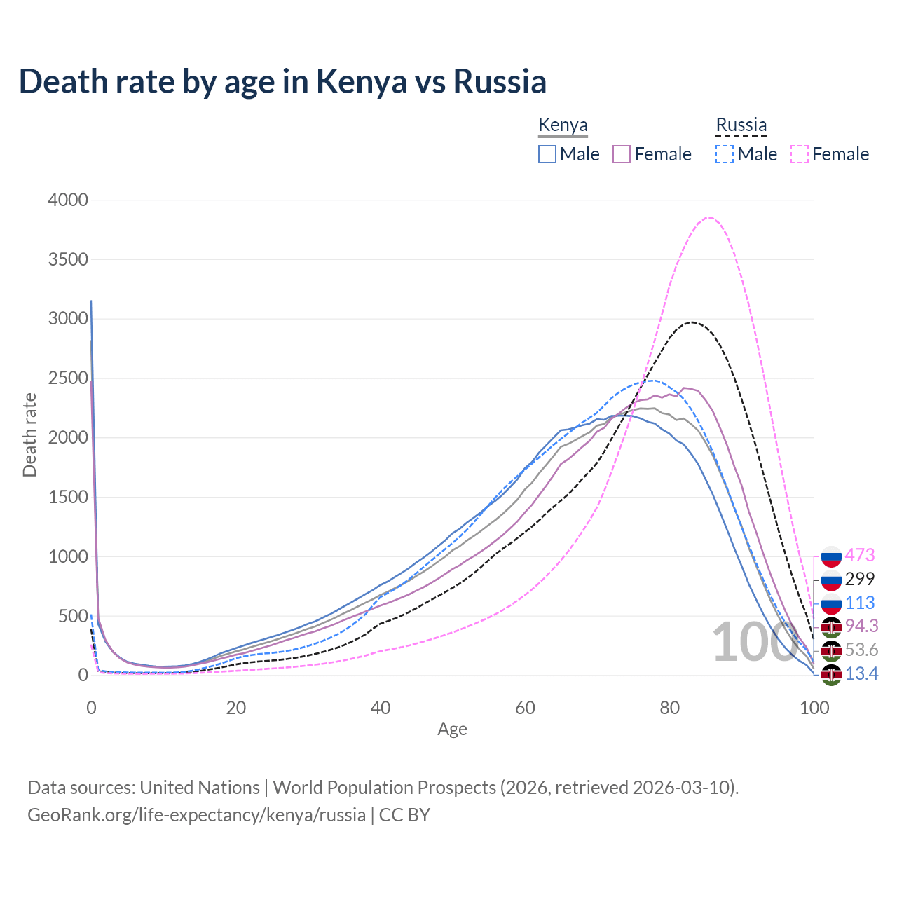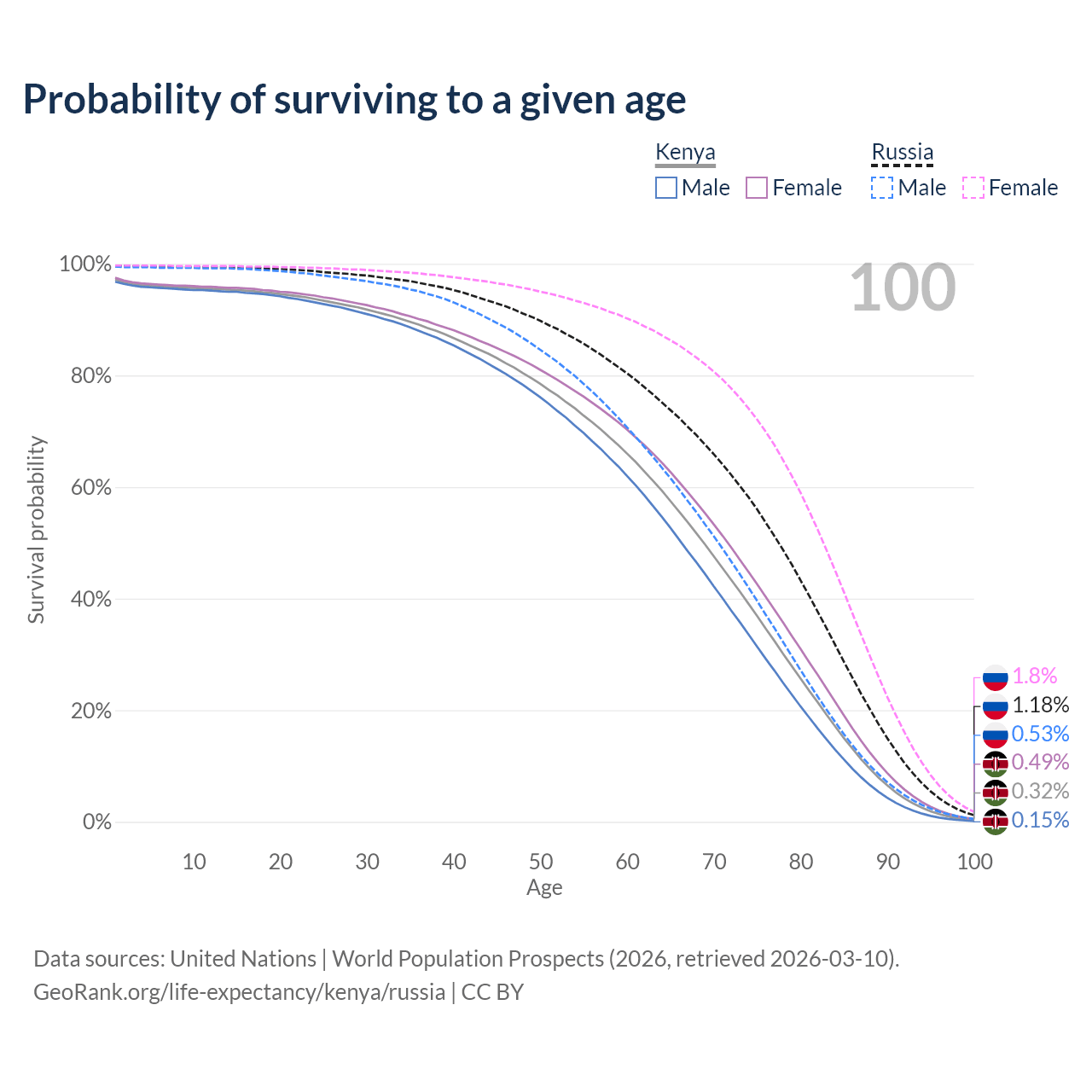 This life expectancy calculator shows the odds of living to 100, 95, 90, and below based on current age for both males and females in Kenya and Russia, along with mean and median age of death. The calculations are based on the 2026 life tables (actuarial tables) from the UN World Population Prospects.