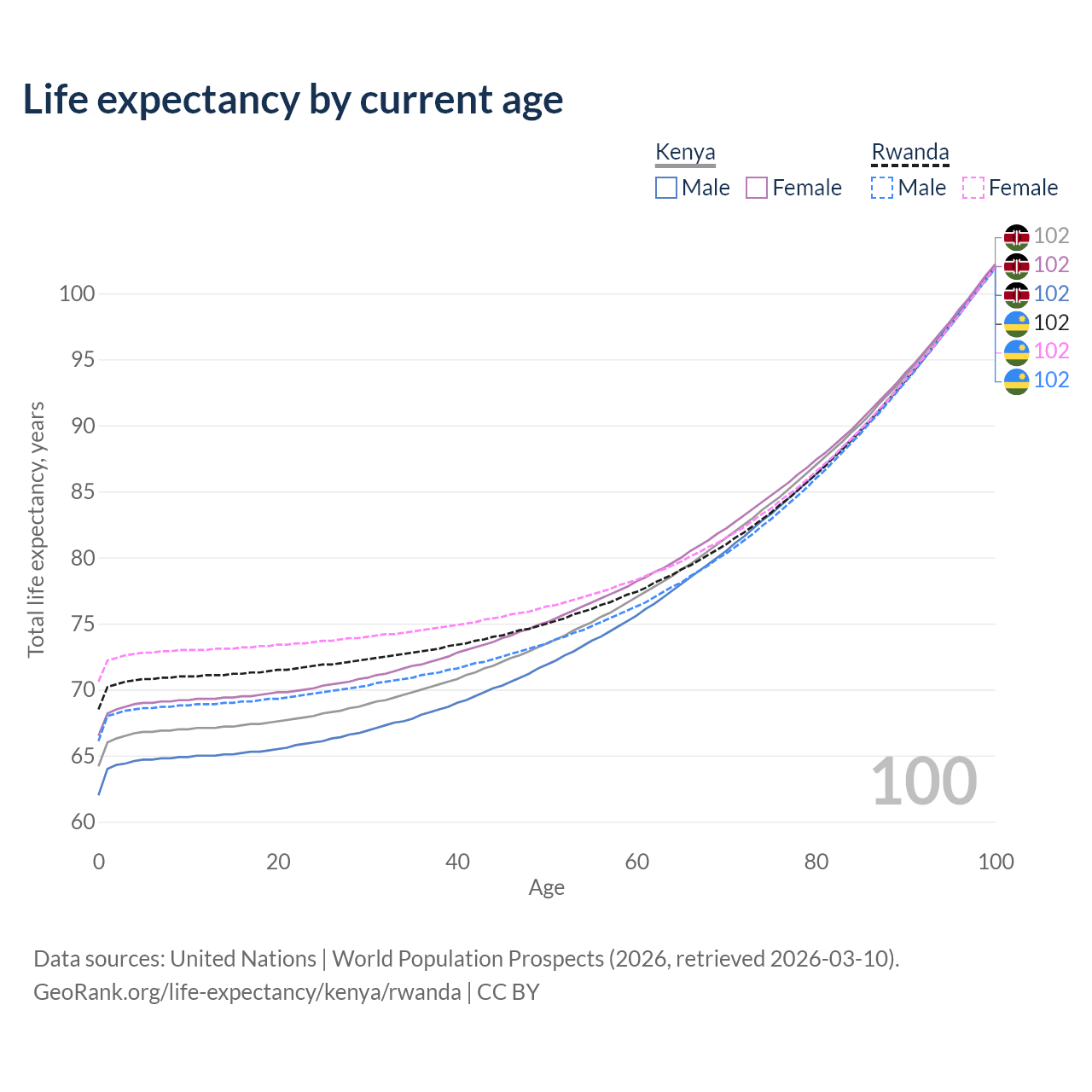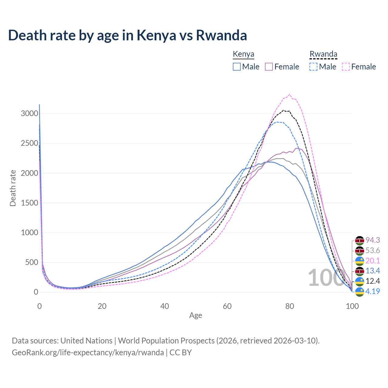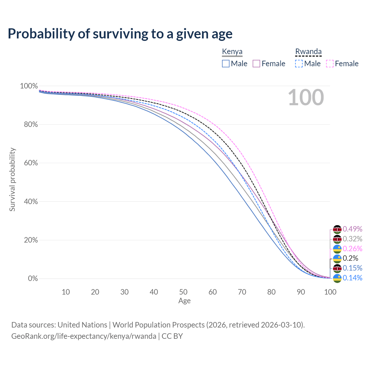 This life expectancy calculator shows the odds of living to 100, 95, 90, and below based on current age for both males and females in Kenya and Rwanda, along with mean and median age of death. The calculations are based on the 2026 life tables (actuarial tables) from the UN World Population Prospects.
