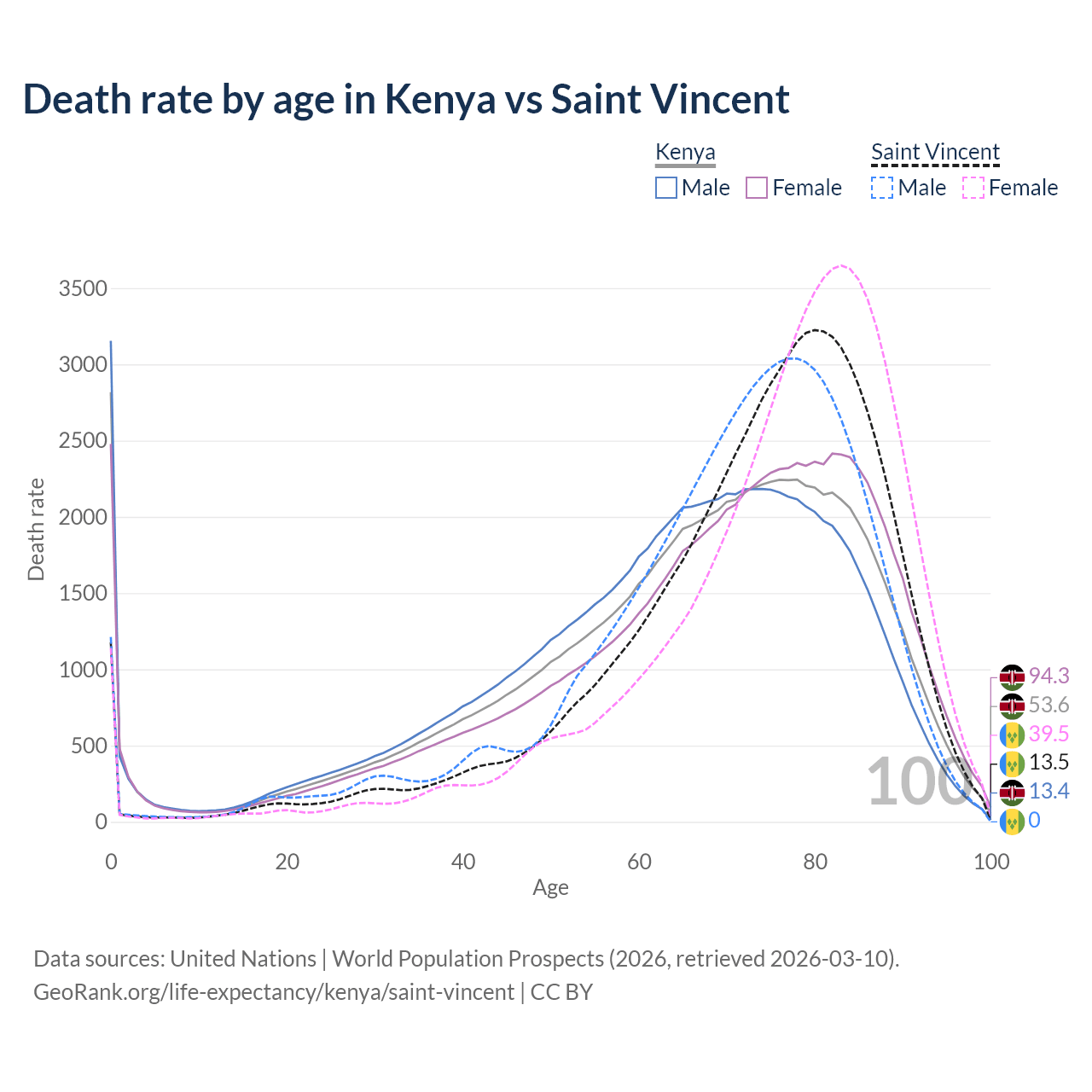 In Kenya, the most common age of death is 0, compared to 80 in Saint Vincent. The median age of death is 68.8 in Kenya and 75.6 in Saint Vincent, meaning only half of each cohort is expected to live past that age.