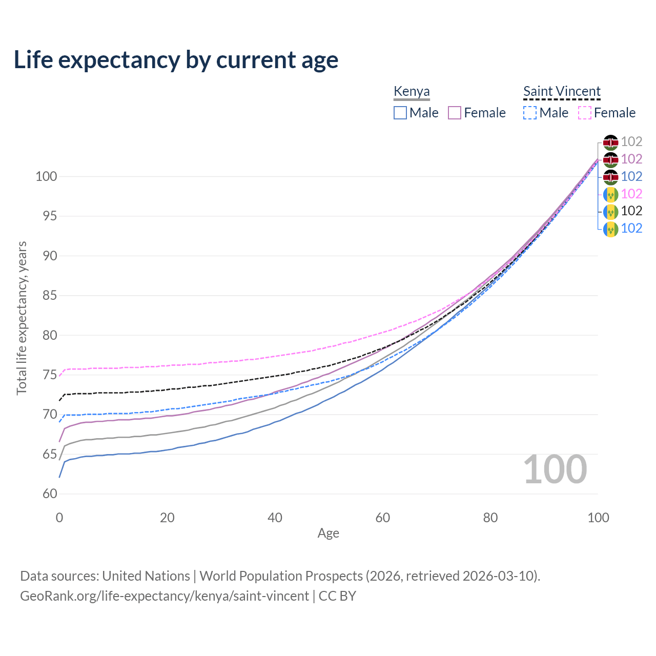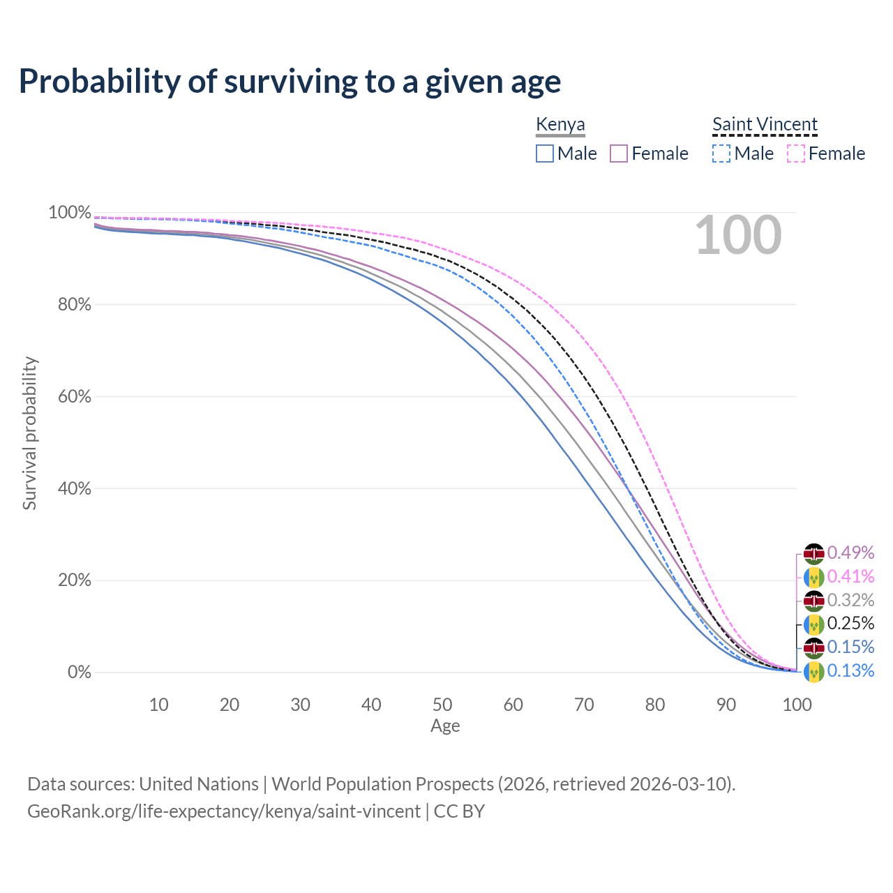 This life expectancy calculator shows the odds of living to 100, 95, 90, and below based on current age for both males and females in Kenya and Saint Vincent, along with mean and median age of death. The calculations are based on the 2026 life tables (actuarial tables) from the UN World Population Prospects.