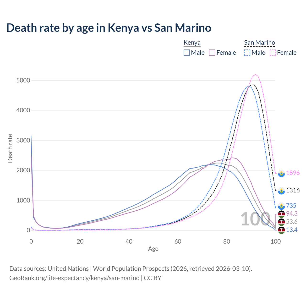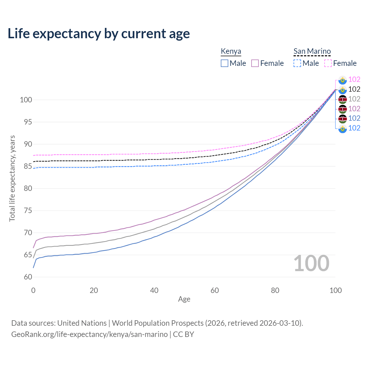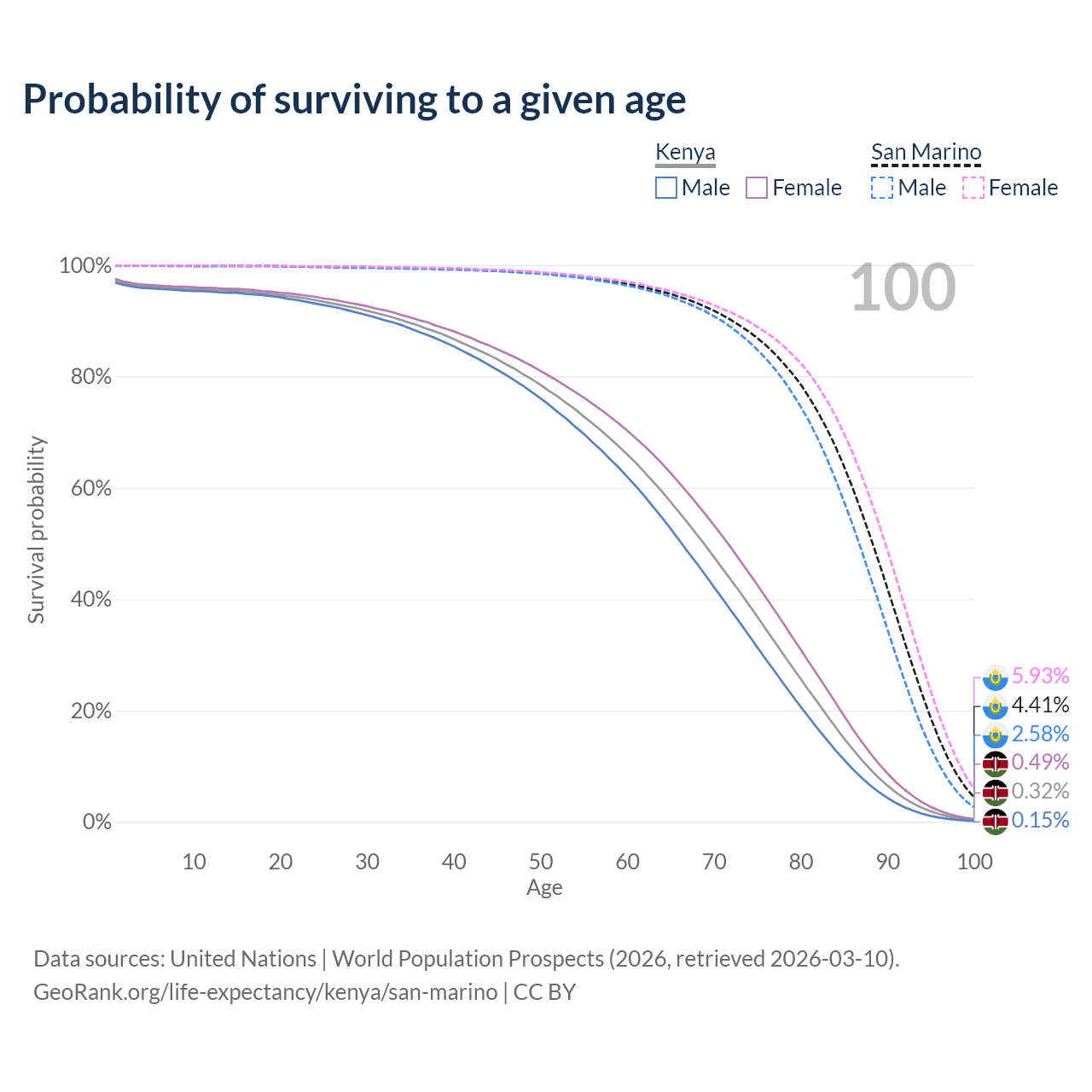 This life expectancy calculator shows the odds of living to 100, 95, 90, and below based on current age for both males and females in Kenya and San Marino, along with mean and median age of death. The calculations are based on the 2026 life tables (actuarial tables) from the UN World Population Prospects.