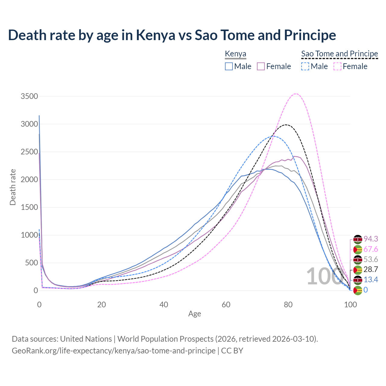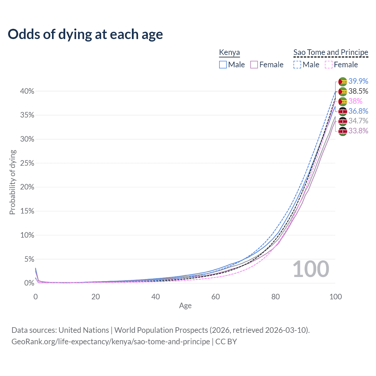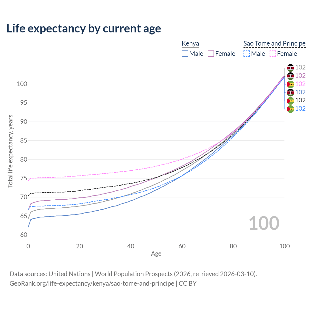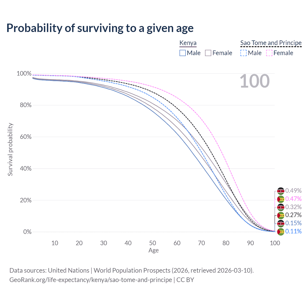 This life expectancy calculator shows the odds of living to 100, 95, 90, and below based on current age for both males and females in Kenya and Sao Tome and Principe, along with mean and median age of death. The calculations are based on the 2026 life tables (actuarial tables) from the UN World Population Prospects.