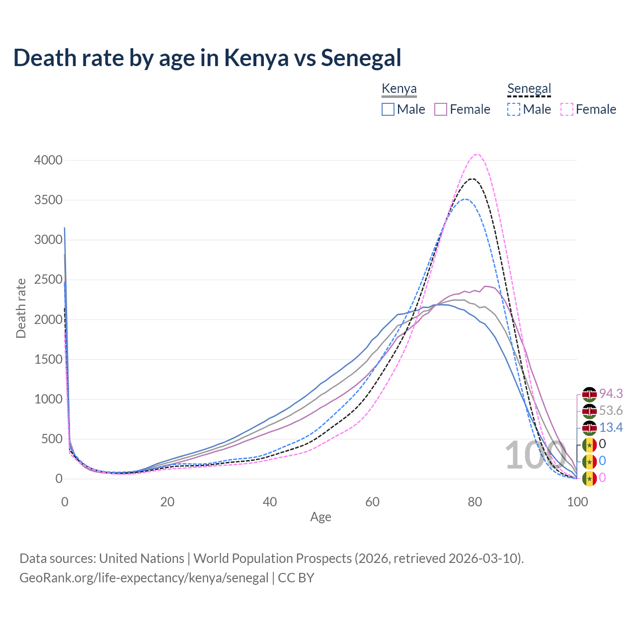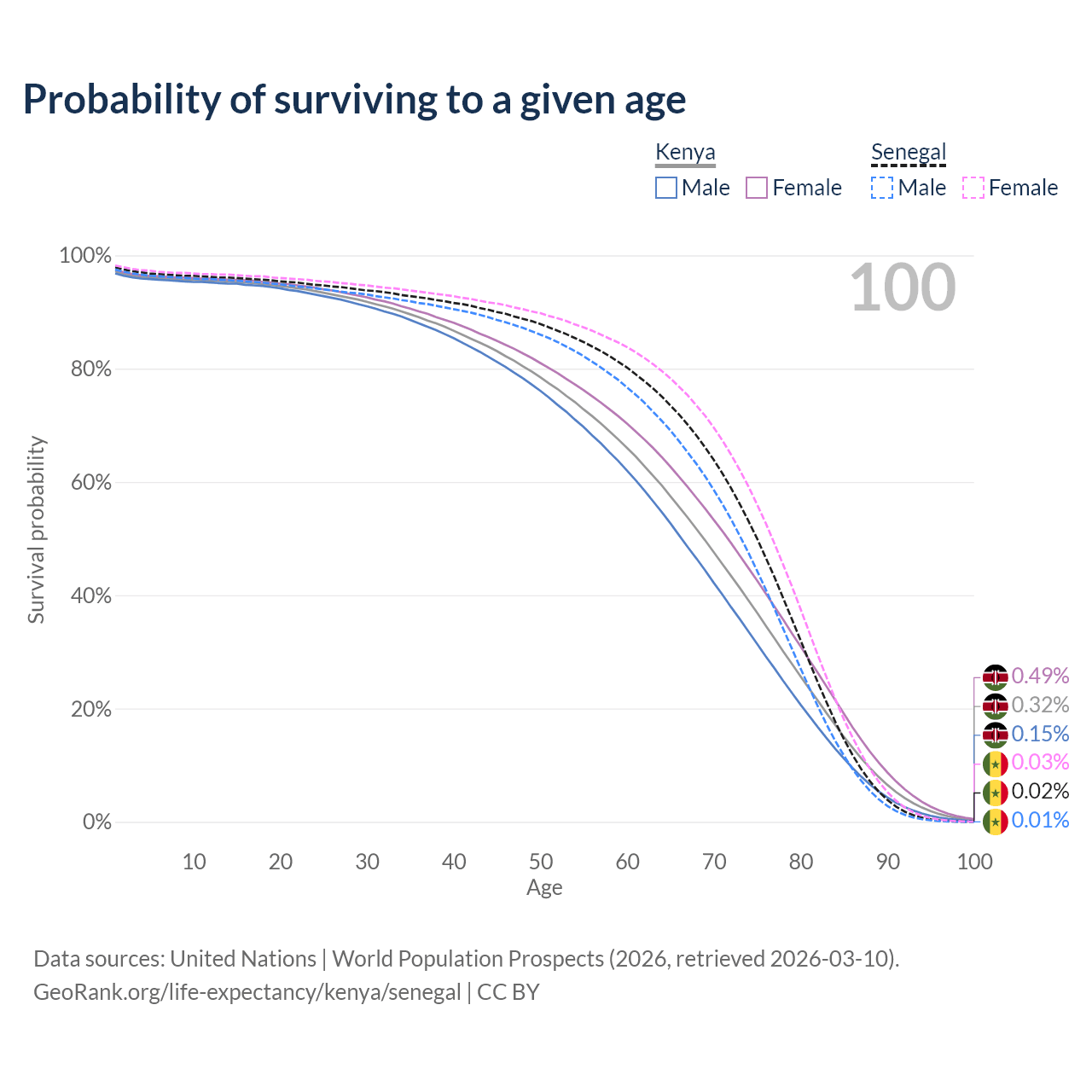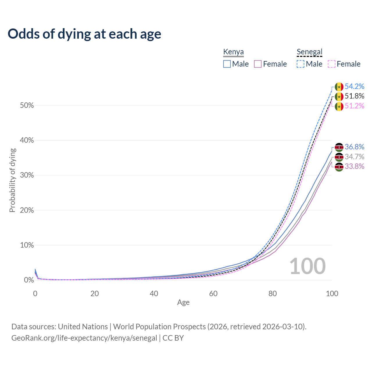 This life expectancy calculator shows the odds of living to 100, 95, 90, and below based on current age for both males and females in Kenya and Senegal, along with mean and median age of death. The calculations are based on the 2026 life tables (actuarial tables) from the UN World Population Prospects.