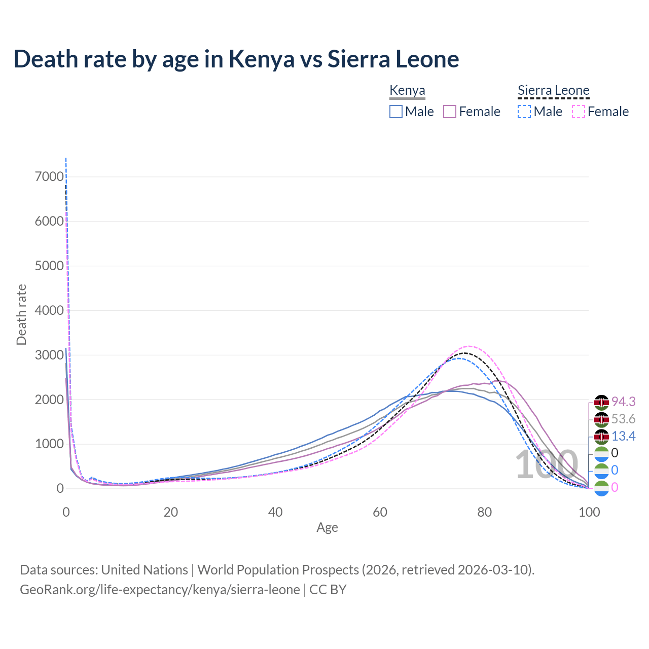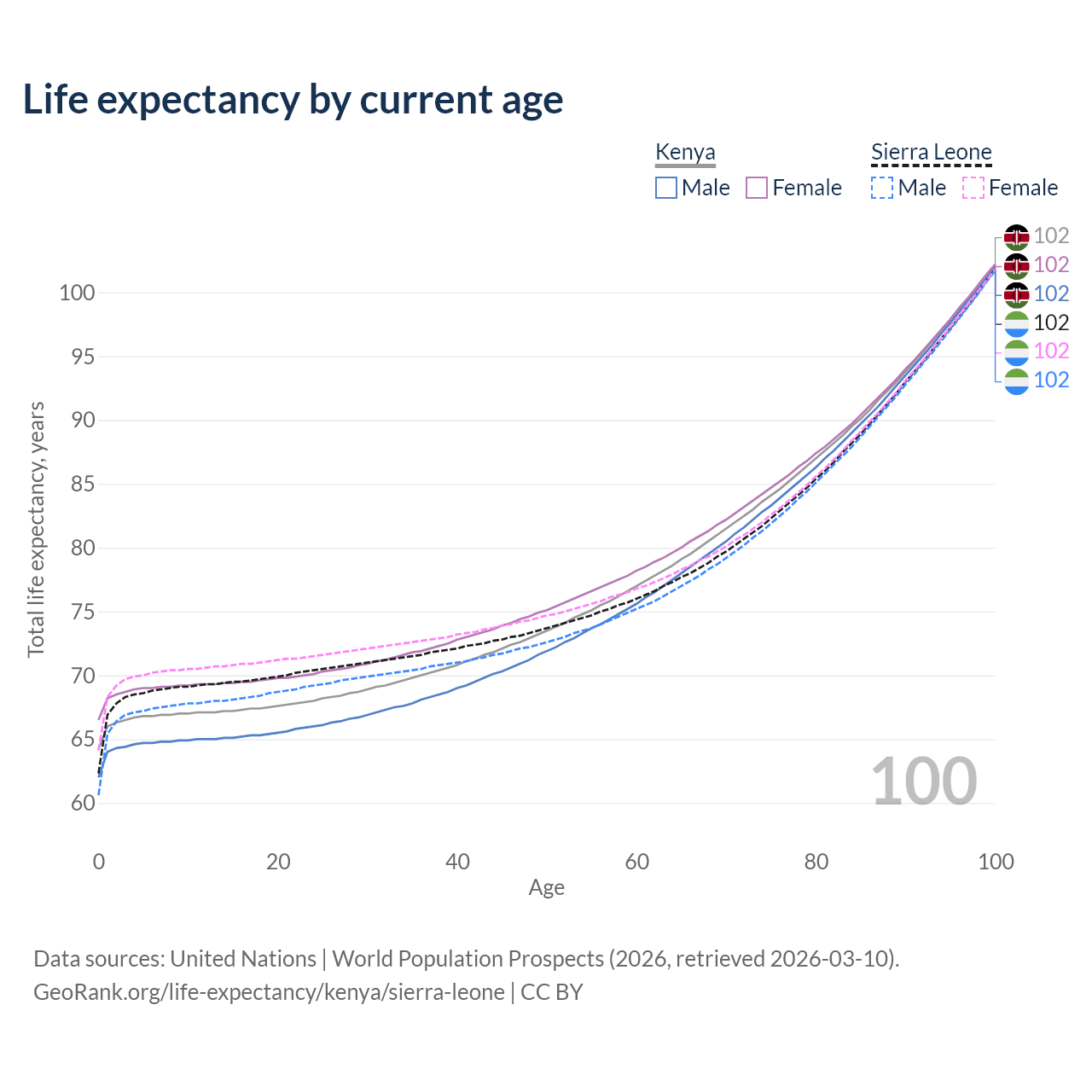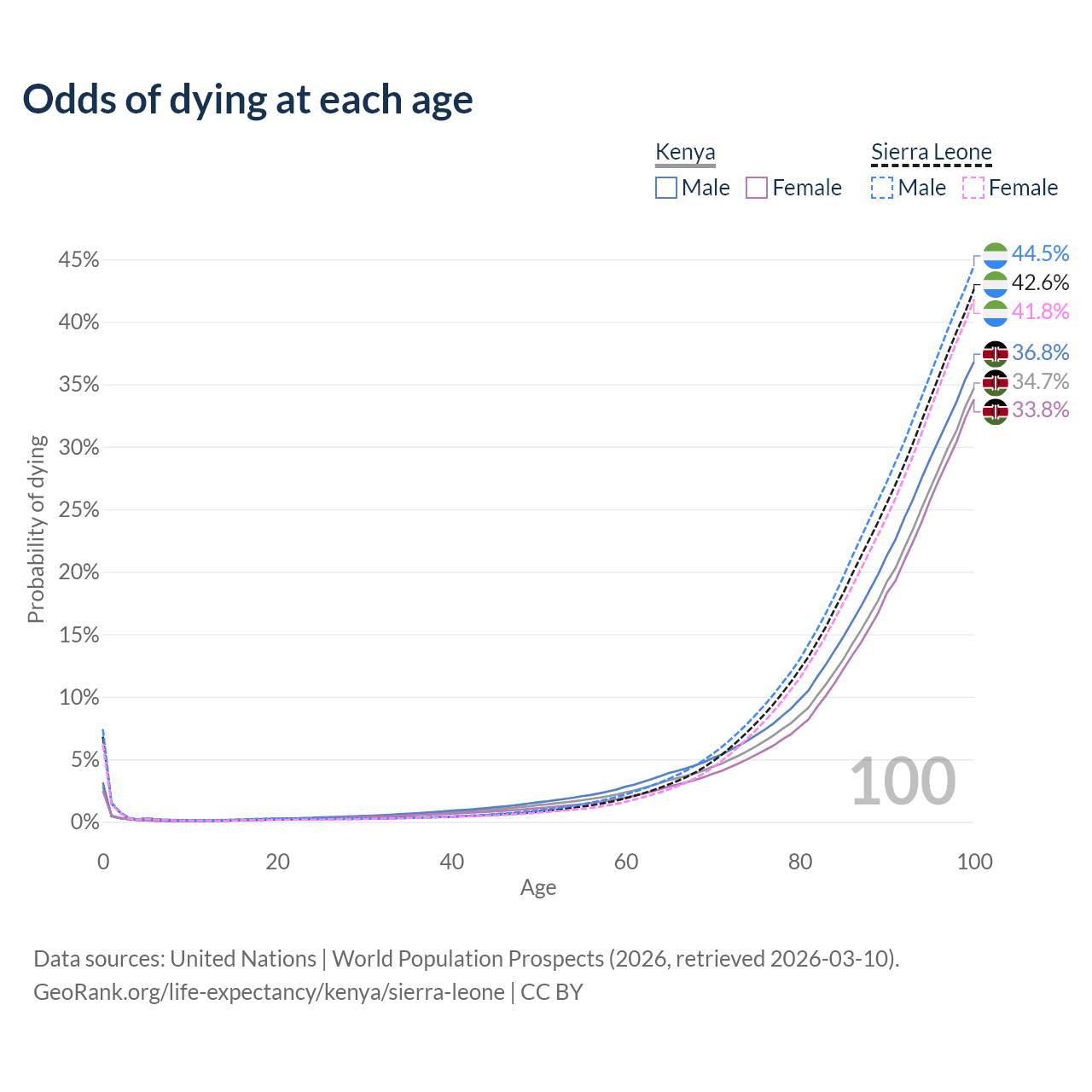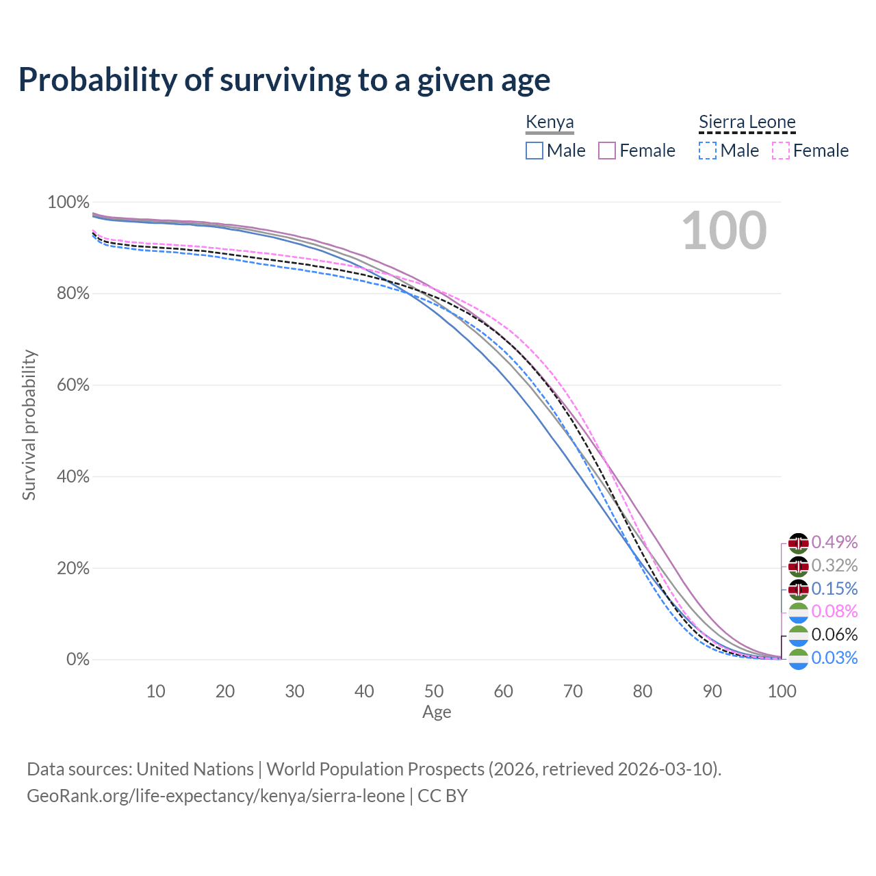 This life expectancy calculator shows the odds of living to 100, 95, 90, and below based on current age for both males and females in Kenya and Sierra Leone, along with mean and median age of death. The calculations are based on the 2026 life tables (actuarial tables) from the UN World Population Prospects.