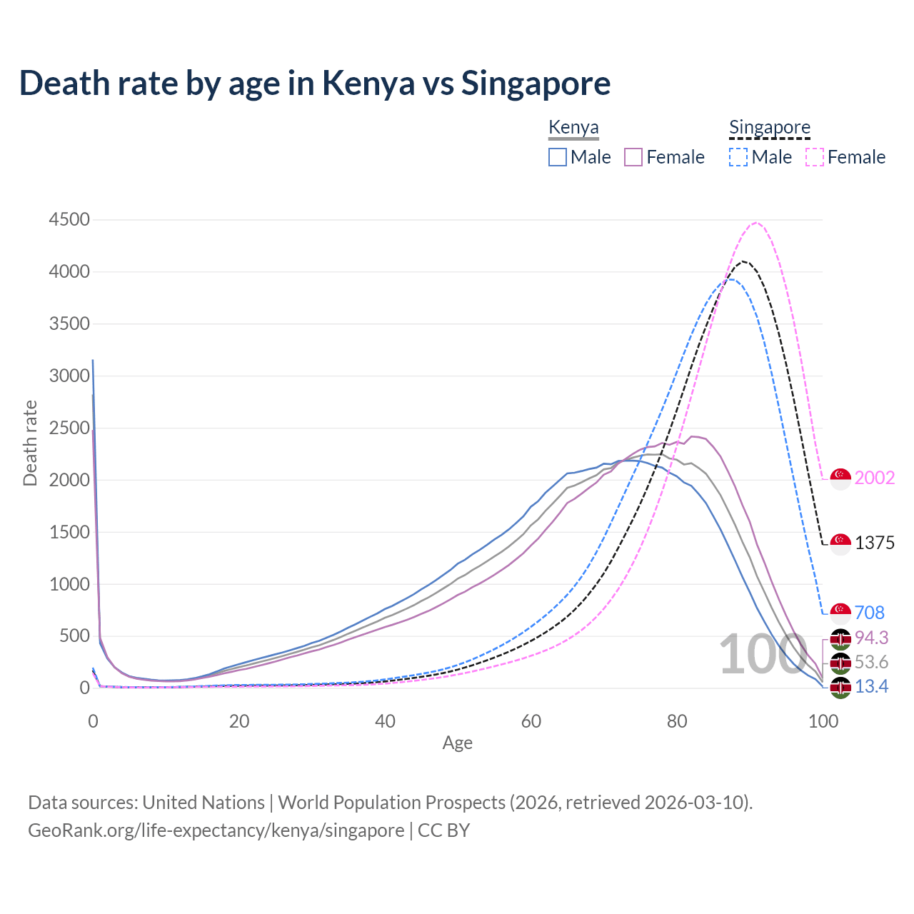 In Kenya, the most common age of death is 0, compared to 89 in Singapore. The median age of death is 68.8 in Kenya and 86.5 in Singapore, meaning only half of each cohort is expected to live past that age.