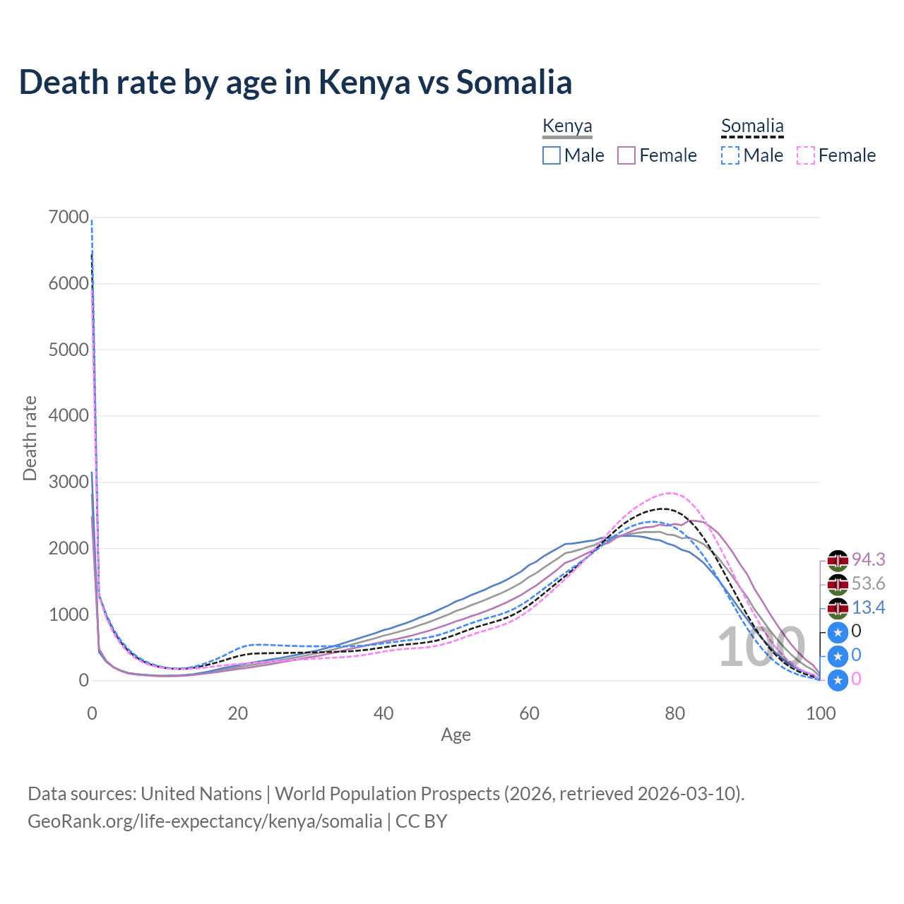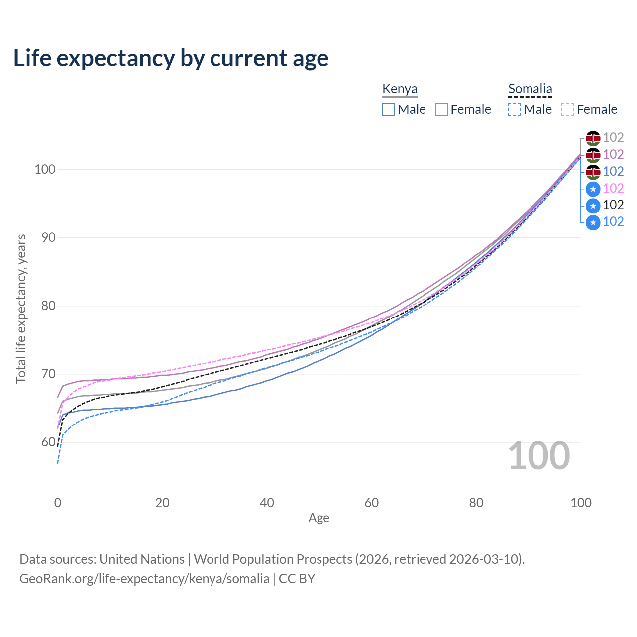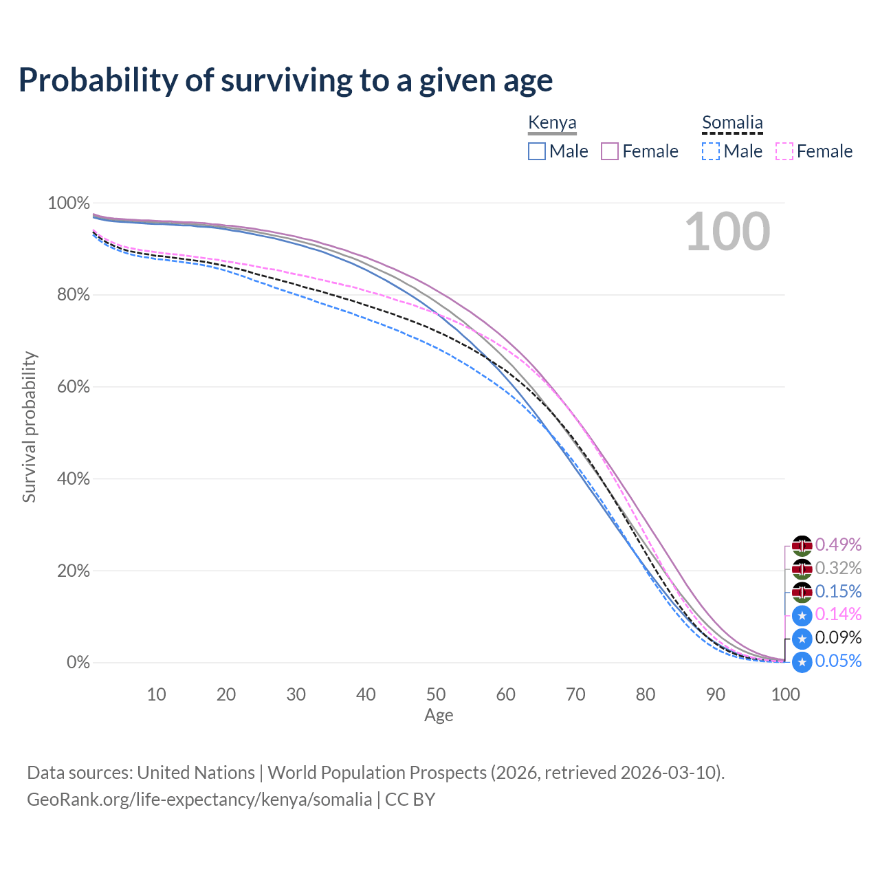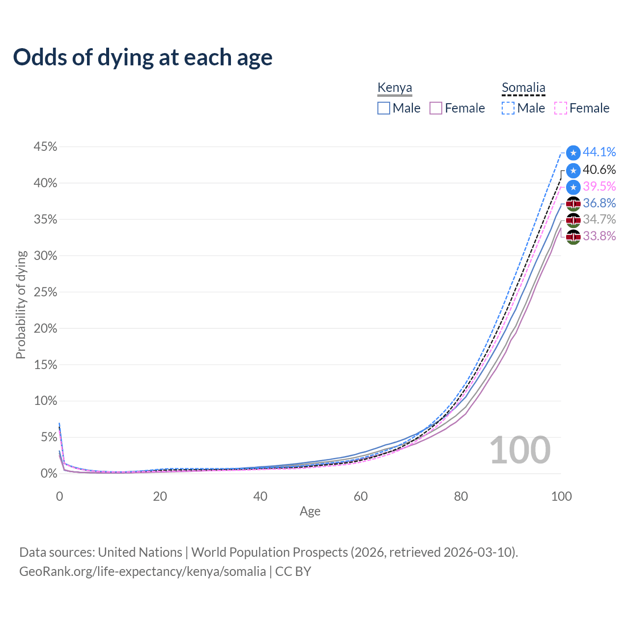 This life expectancy calculator shows the odds of living to 100, 95, 90, and below based on current age for both males and females in Kenya and Somalia, along with mean and median age of death. The calculations are based on the 2026 life tables (actuarial tables) from the UN World Population Prospects.