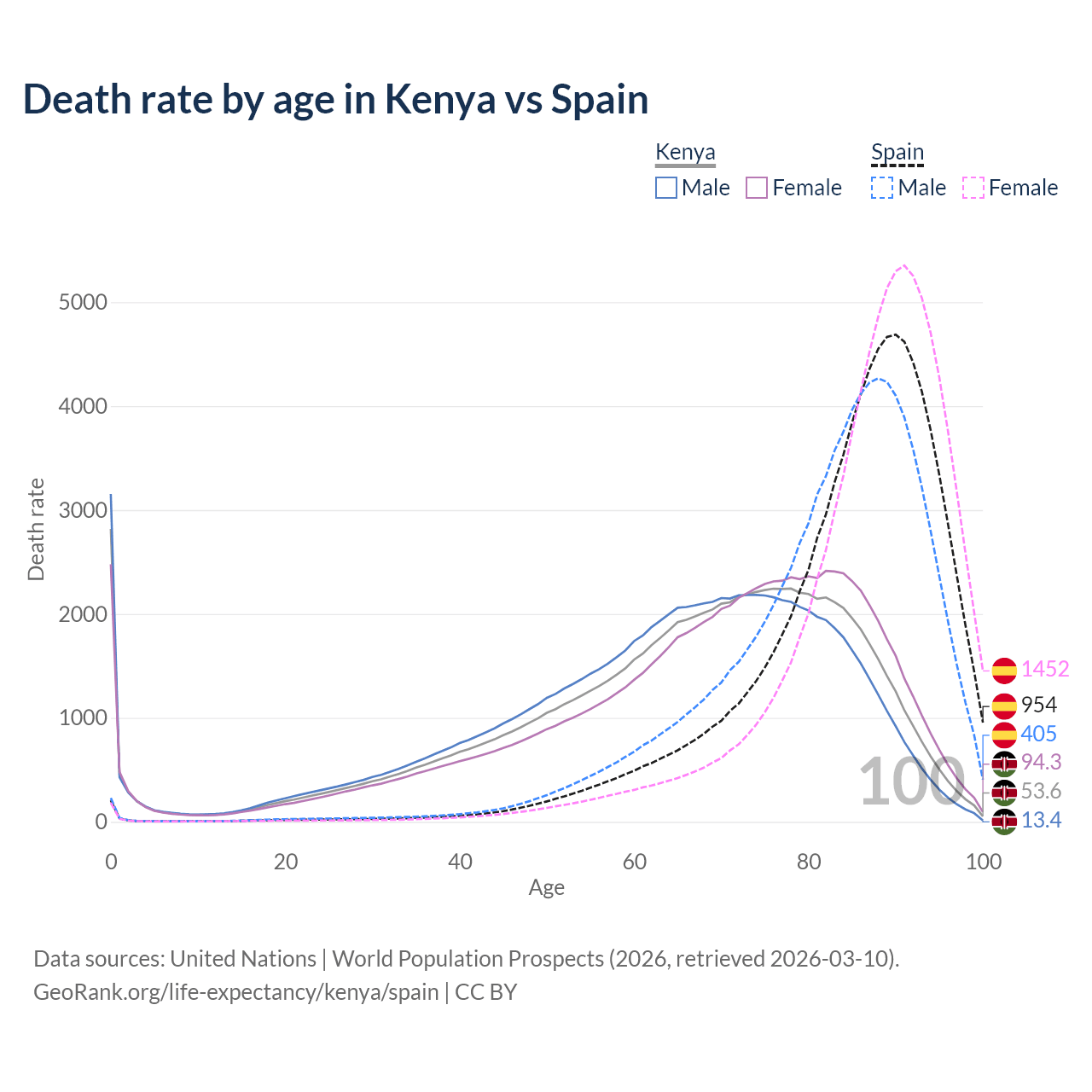 This life expectancy calculator shows the odds of living to 100, 95, 90, and below based on current age for both males and females in Kenya and Spain, along with mean and median age of death. The calculations are based on the 2026 life tables (actuarial tables) from the UN World Population Prospects.