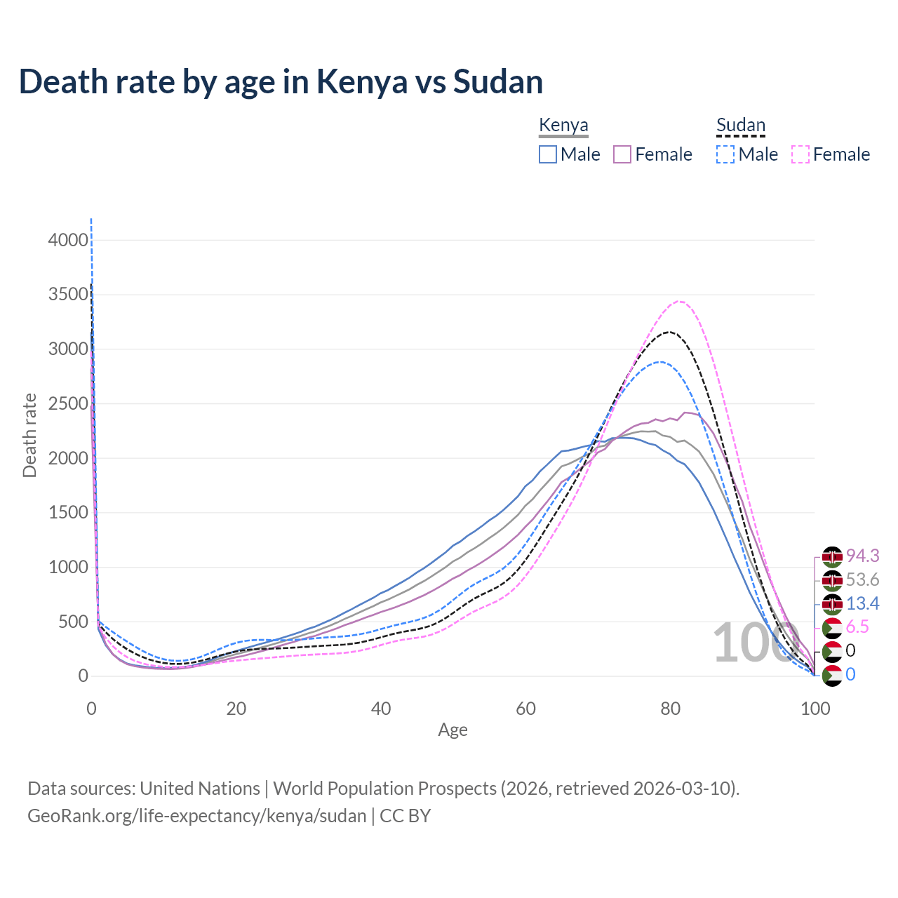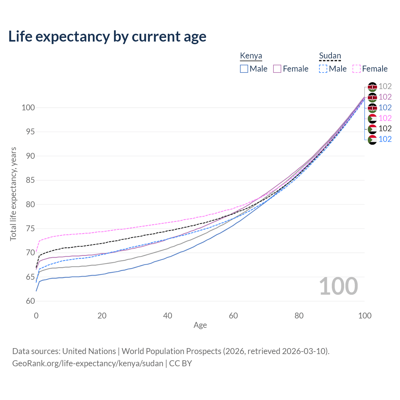 This life expectancy calculator shows the odds of living to 100, 95, 90, and below based on current age for both males and females in Kenya and Sudan, along with mean and median age of death. The calculations are based on the 2026 life tables (actuarial tables) from the UN World Population Prospects.
