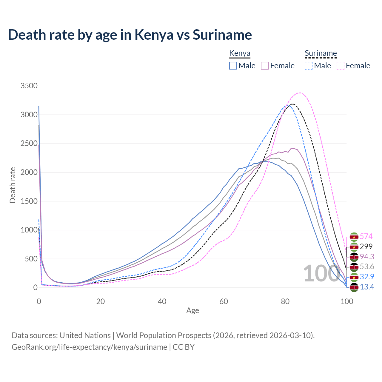 In Kenya, the most common age of death is 0, compared to 82 in Suriname. The median age of death is 68.8 in Kenya and 78 in Suriname, meaning only half of each cohort is expected to live past that age.