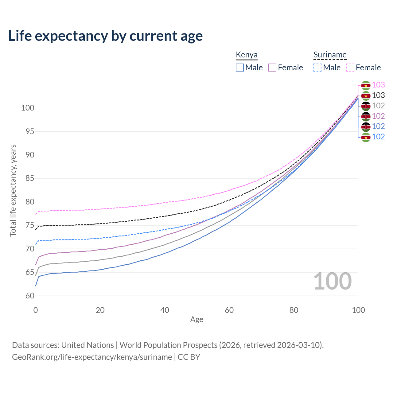 This life expectancy calculator shows the odds of living to 100, 95, 90, and below based on current age for both males and females in Kenya and Suriname, along with mean and median age of death. The calculations are based on the 2026 life tables (actuarial tables) from the UN World Population Prospects.