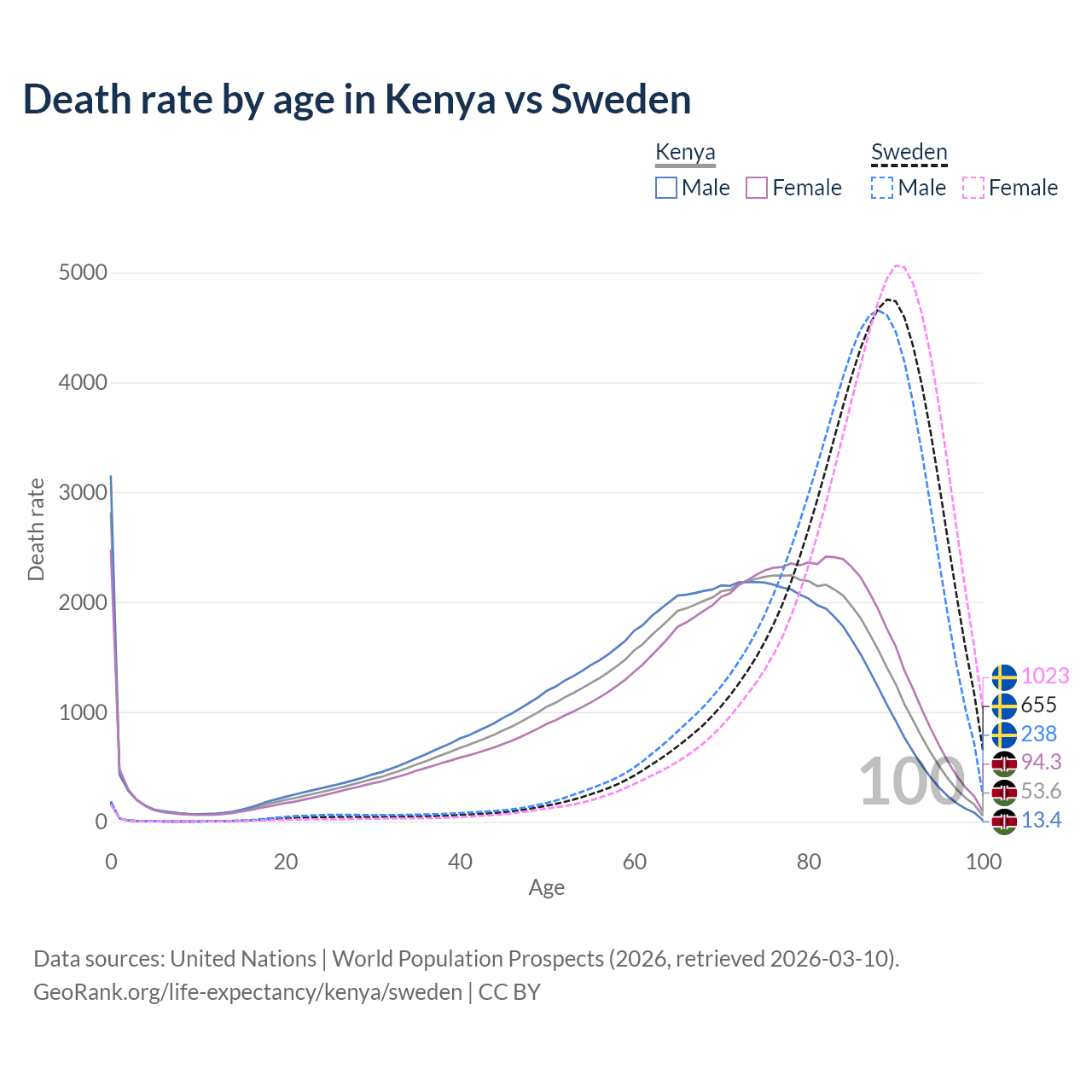 In Kenya, the most common age of death is 0, compared to 89 in Sweden. The median age of death is 68.8 in Kenya and 86.5 in Sweden, meaning only half of each cohort is expected to live past that age.