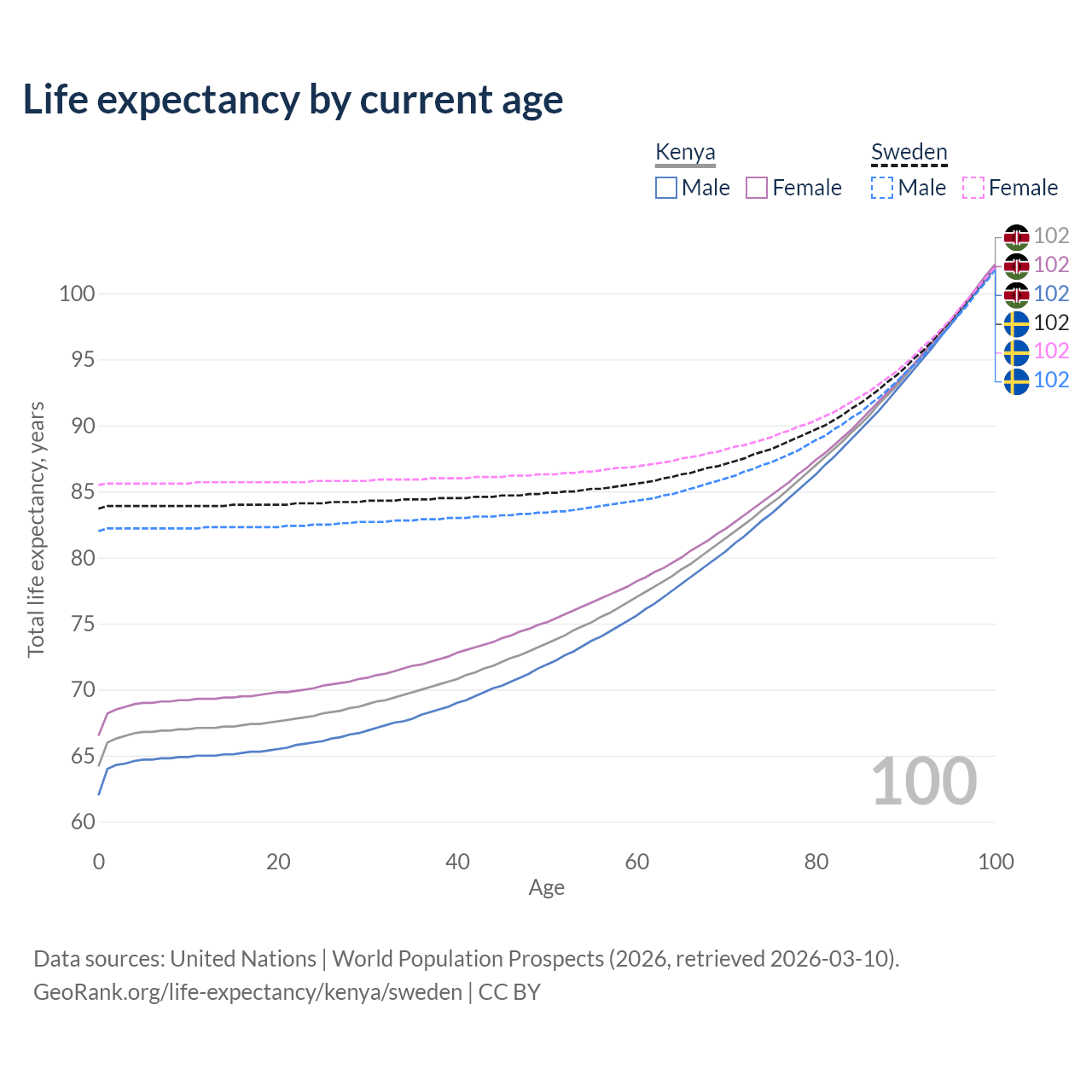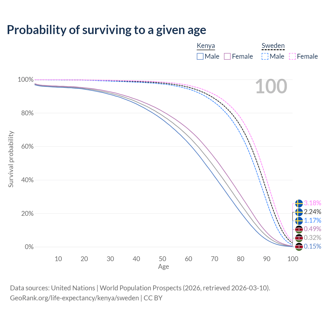 This life expectancy calculator shows the odds of living to 100, 95, 90, and below based on current age for both males and females in Kenya and Sweden, along with mean and median age of death. The calculations are based on the 2026 life tables (actuarial tables) from the UN World Population Prospects.