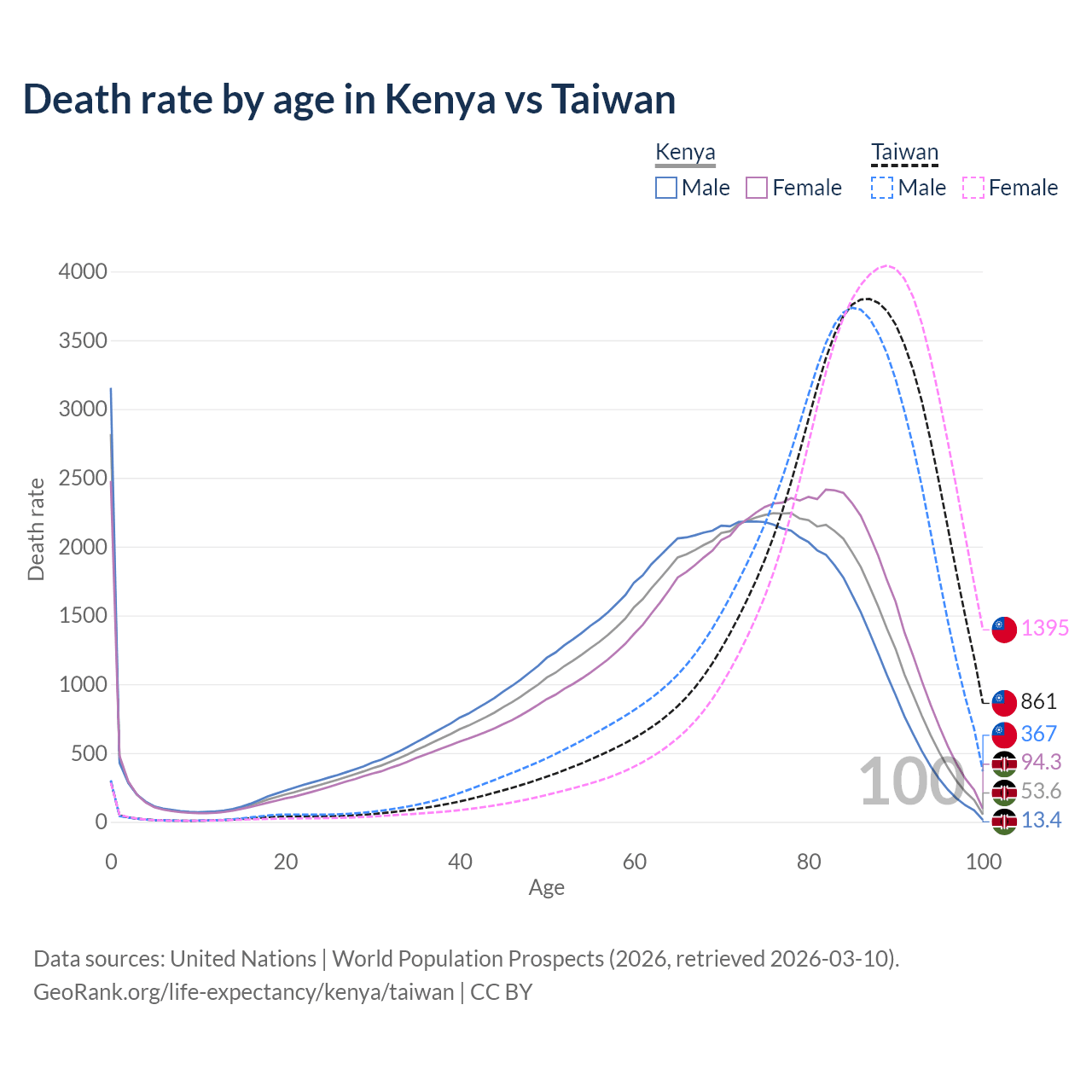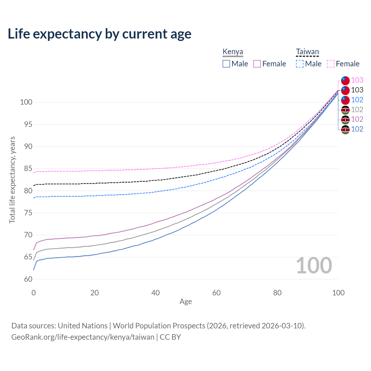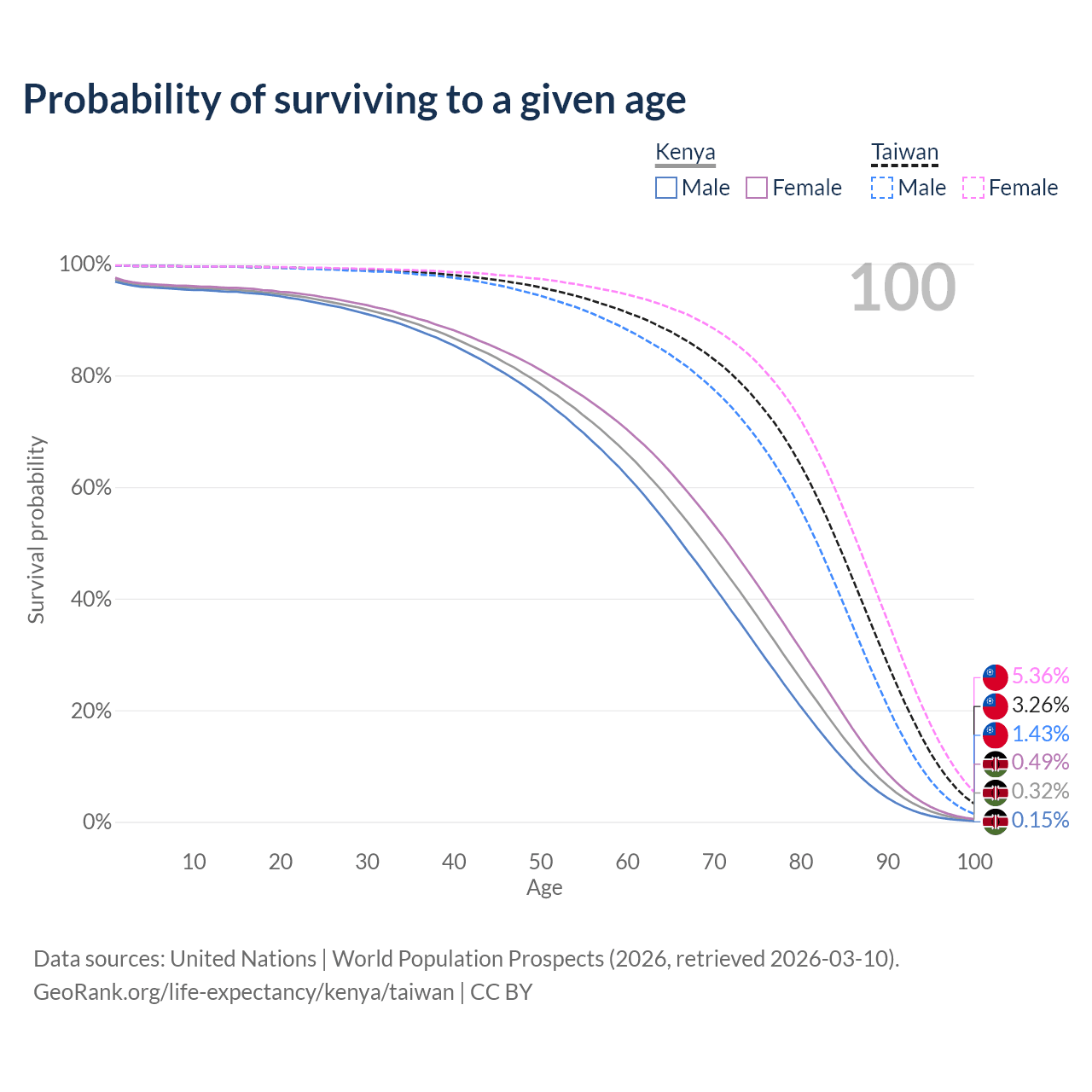 This life expectancy calculator shows the odds of living to 100, 95, 90, and below based on current age for both males and females in Kenya and Taiwan, along with mean and median age of death. The calculations are based on the 2026 life tables (actuarial tables) from the UN World Population Prospects.