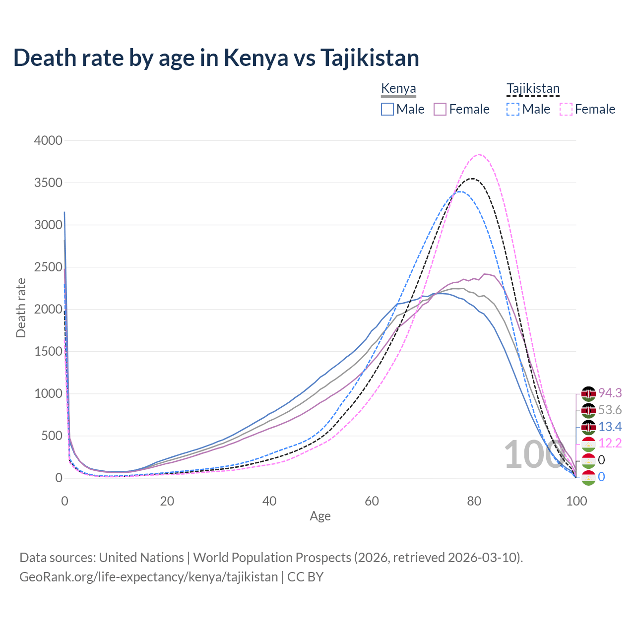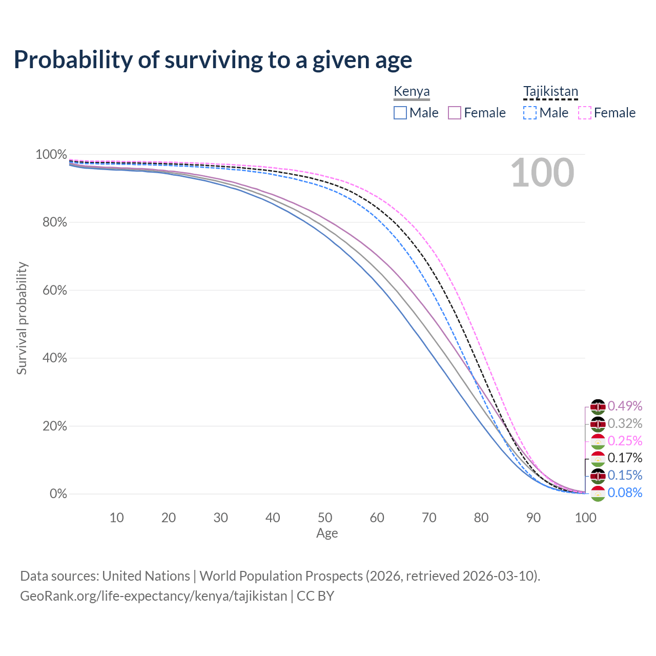 This life expectancy calculator shows the odds of living to 100, 95, 90, and below based on current age for both males and females in Kenya and Tajikistan, along with mean and median age of death. The calculations are based on the 2026 life tables (actuarial tables) from the UN World Population Prospects.