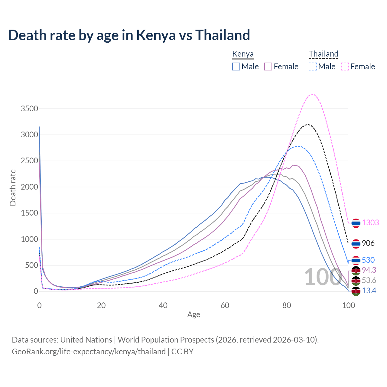 In Kenya, the most common age of death is 0, compared to 87 in Thailand. The median age of death is 68.8 in Kenya and 81.8 in Thailand, meaning only half of each cohort is expected to live past that age.