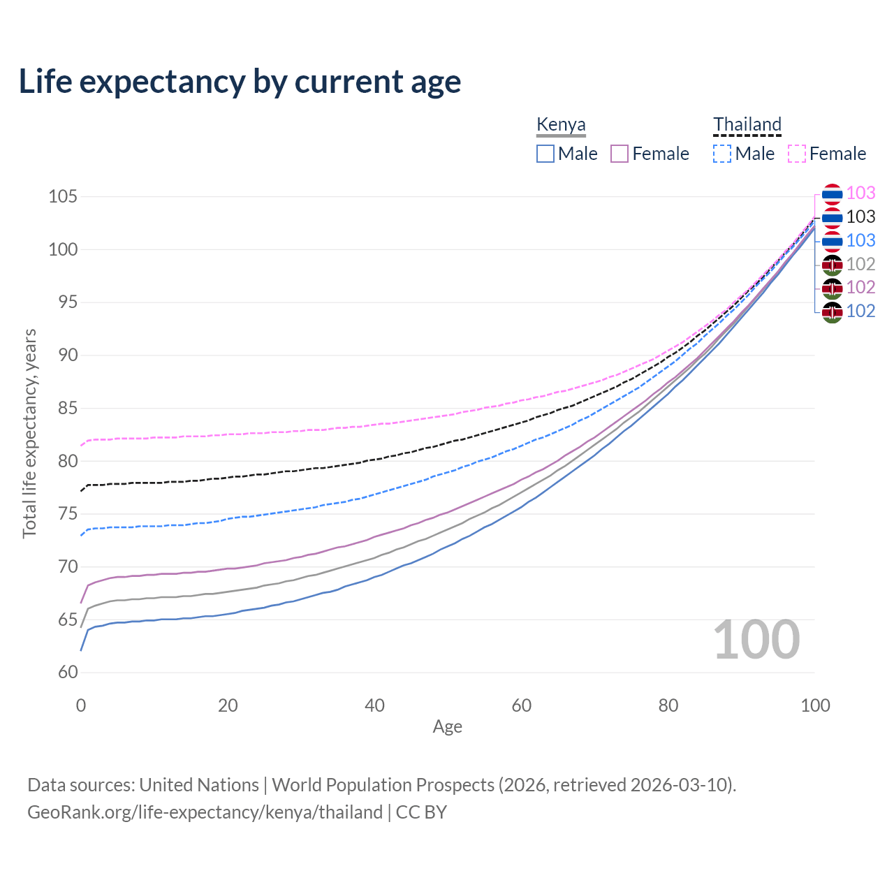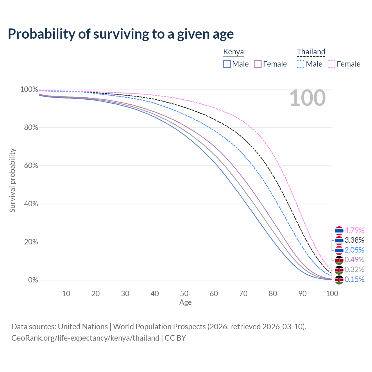 This life expectancy calculator shows the odds of living to 100, 95, 90, and below based on current age for both males and females in Kenya and Thailand, along with mean and median age of death. The calculations are based on the 2026 life tables (actuarial tables) from the UN World Population Prospects.