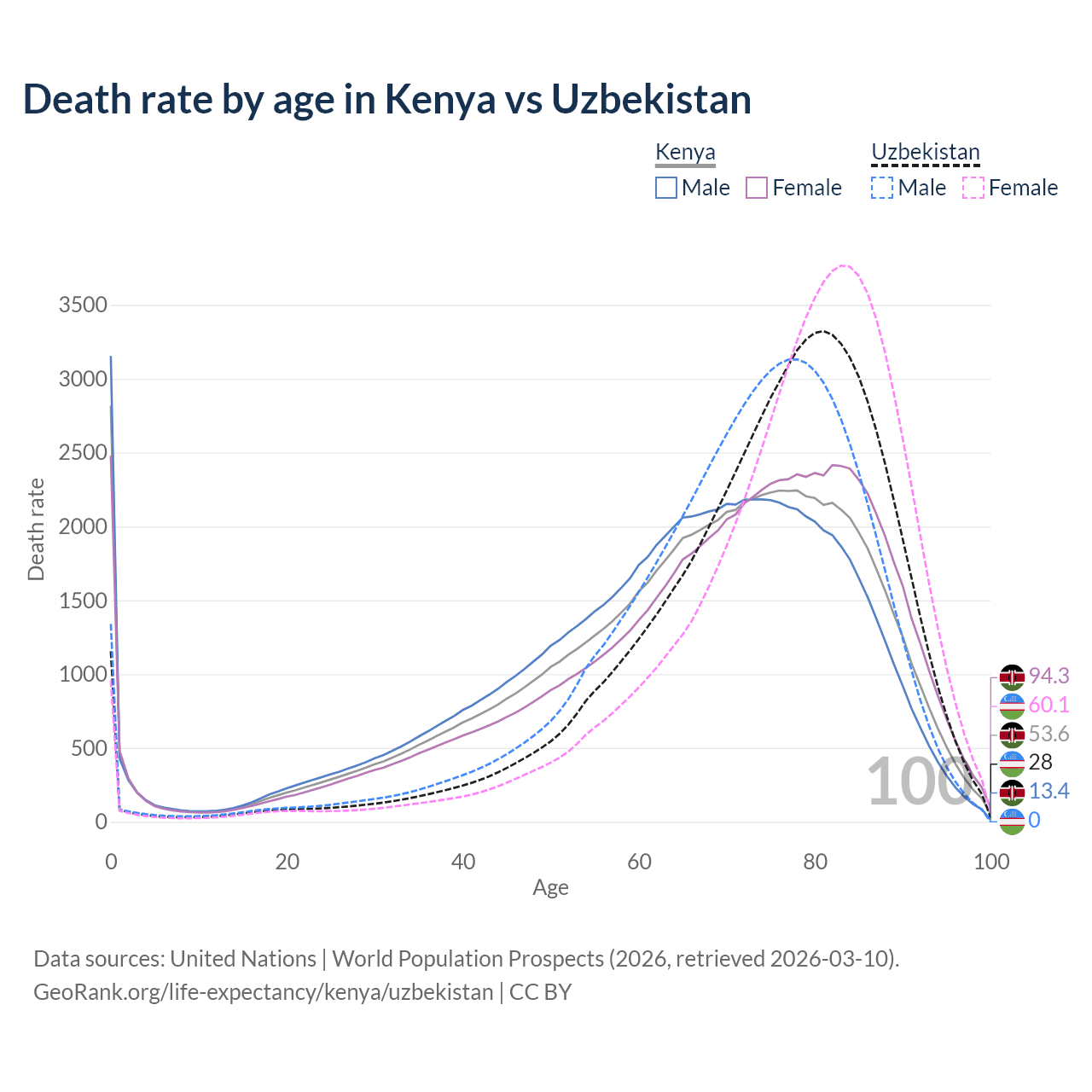 In Kenya, the most common age of death is 0, compared to 81 in Uzbekistan. The median age of death is 68.8 in Kenya and 76.4 in Uzbekistan, meaning only half of each cohort is expected to live past that age.