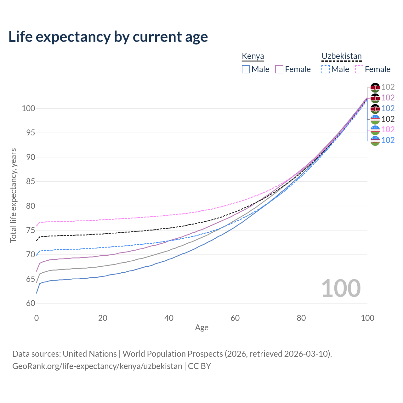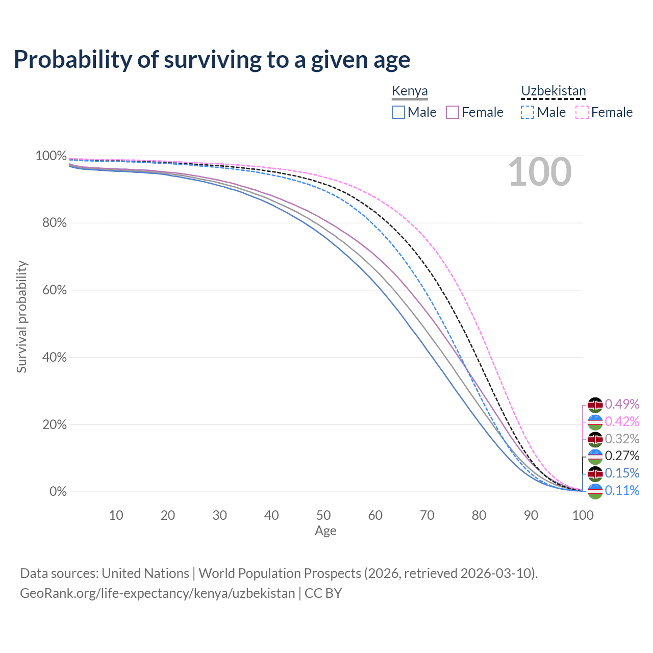 This life expectancy calculator shows the odds of living to 100, 95, 90, and below based on current age for both males and females in Kenya and Uzbekistan, along with mean and median age of death. The calculations are based on the 2026 life tables (actuarial tables) from the UN World Population Prospects.