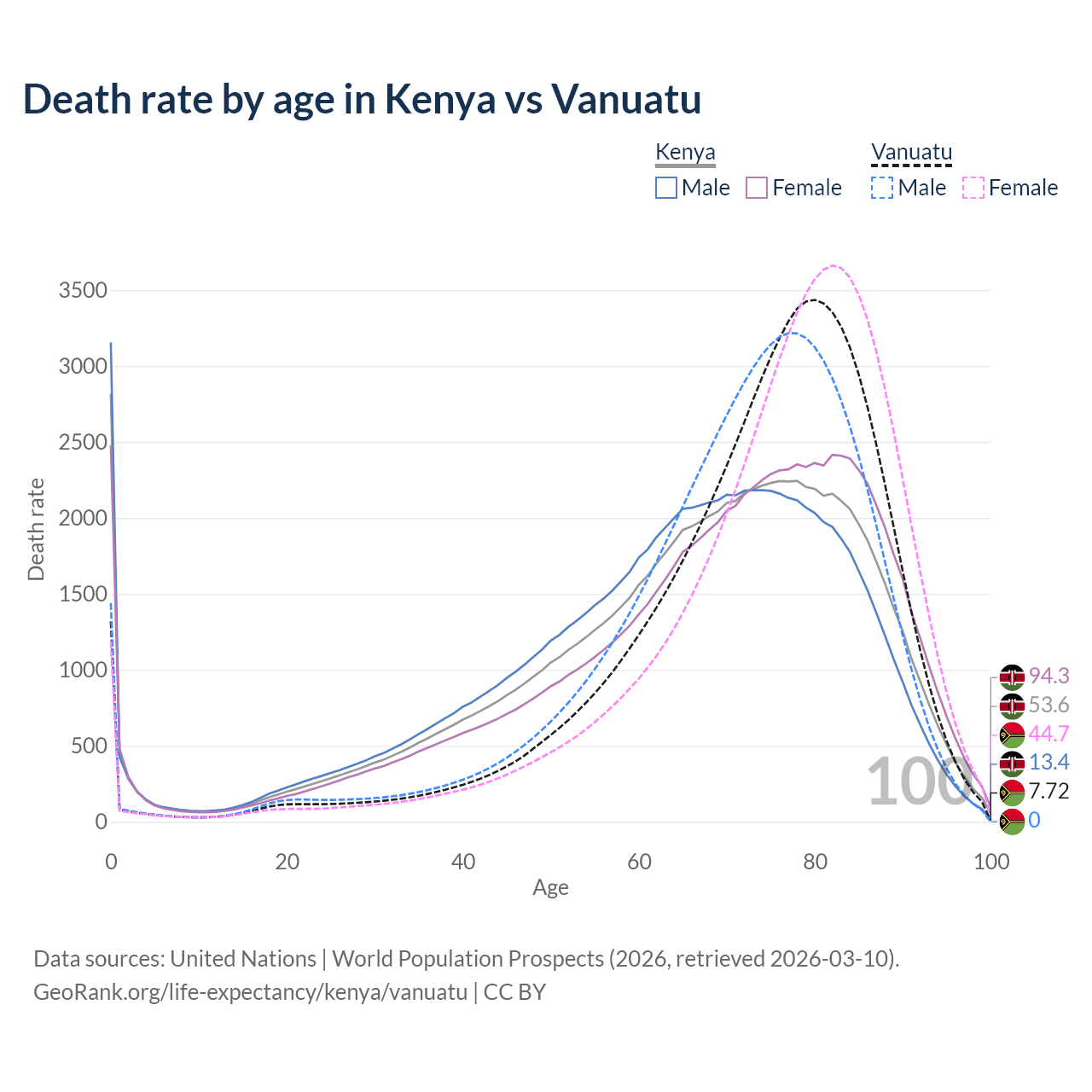 In Kenya, the most common age of death is 0, compared to 80 in Vanuatu. The median age of death is 68.8 in Kenya and 75.9 in Vanuatu, meaning only half of each cohort is expected to live past that age.