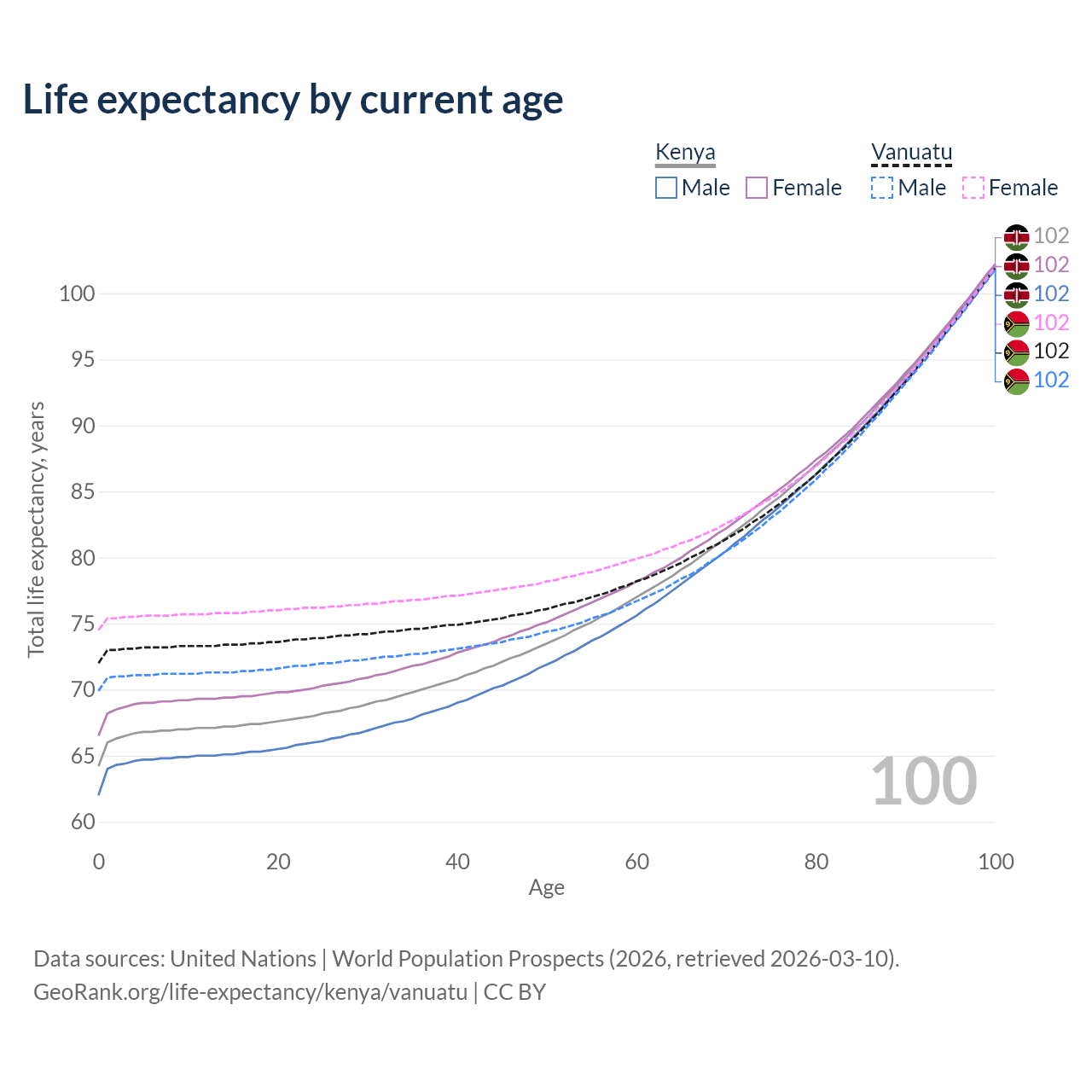 This life expectancy calculator shows the odds of living to 100, 95, 90, and below based on current age for both males and females in Kenya and Vanuatu, along with mean and median age of death. The calculations are based on the 2026 life tables (actuarial tables) from the UN World Population Prospects.