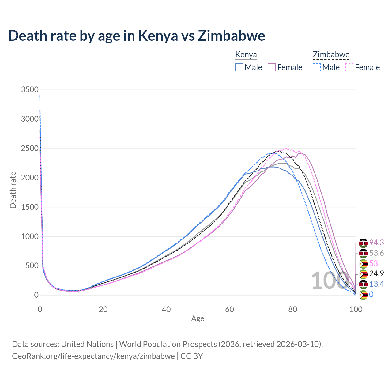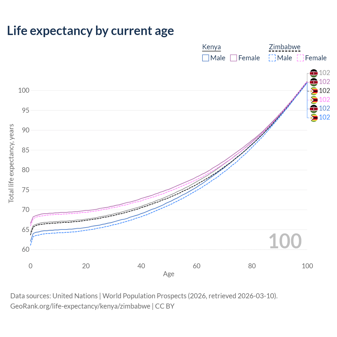 This life expectancy calculator shows the odds of living to 100, 95, 90, and below based on current age for both males and females in Kenya and Zimbabwe, along with mean and median age of death. The calculations are based on the 2026 life tables (actuarial tables) from the UN World Population Prospects.