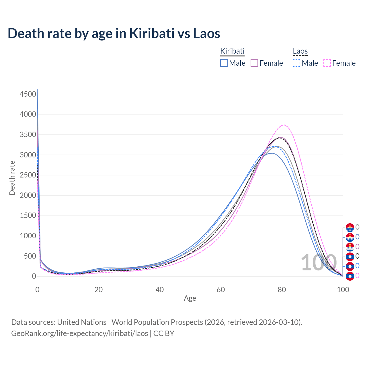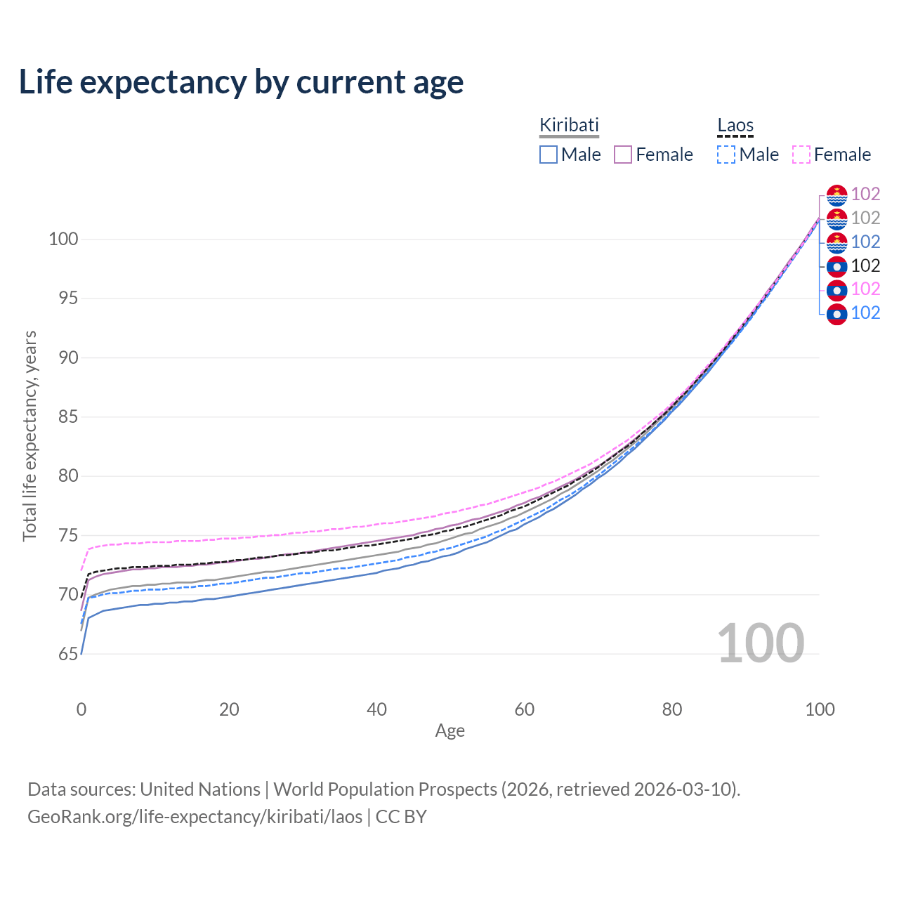 This life expectancy calculator shows the odds of living to 100, 95, 90, and below based on current age for both males and females in Kiribati and Laos, along with mean and median age of death. The calculations are based on the 2026 life tables (actuarial tables) from the UN World Population Prospects.