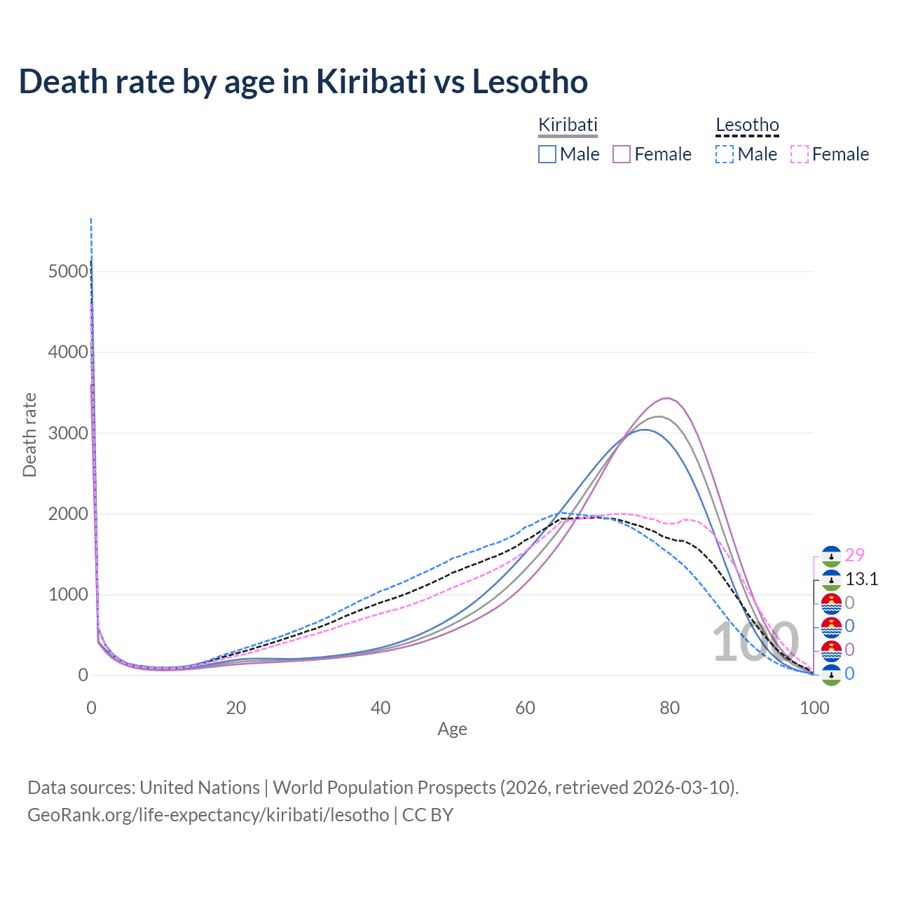 In Kiribati, the most common age of death is 0, compared to 0 in Lesotho. The median age of death is 73.1 in Kiribati and 63.4 in Lesotho, meaning only half of each cohort is expected to live past that age.