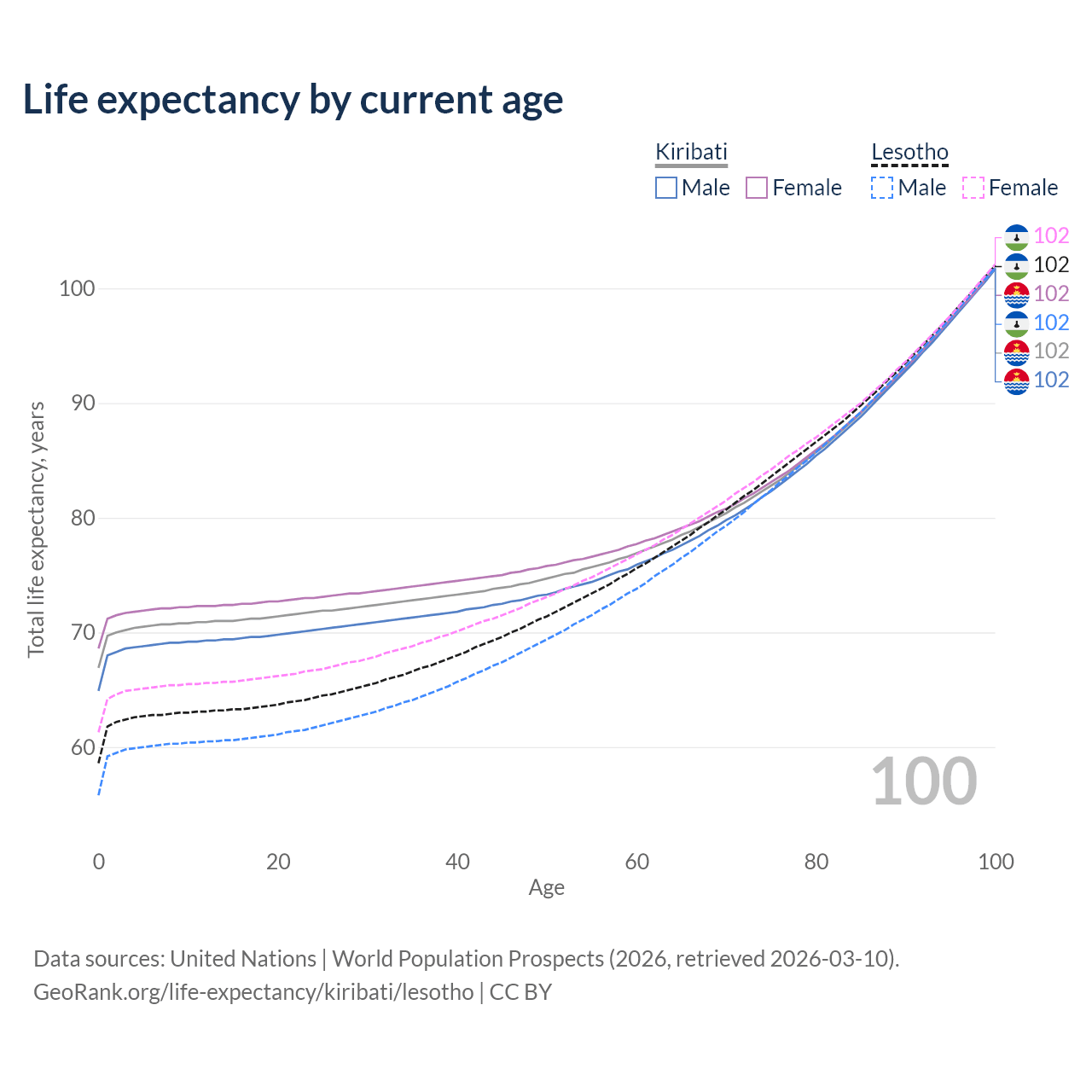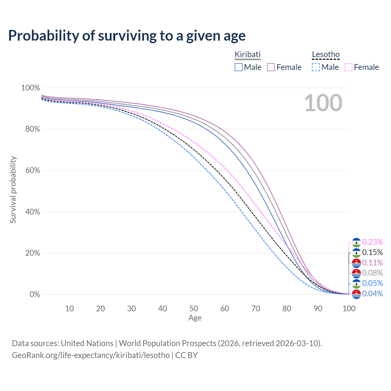 This life expectancy calculator shows the odds of living to 100, 95, 90, and below based on current age for both males and females in Kiribati and Lesotho, along with mean and median age of death. The calculations are based on the 2026 life tables (actuarial tables) from the UN World Population Prospects.