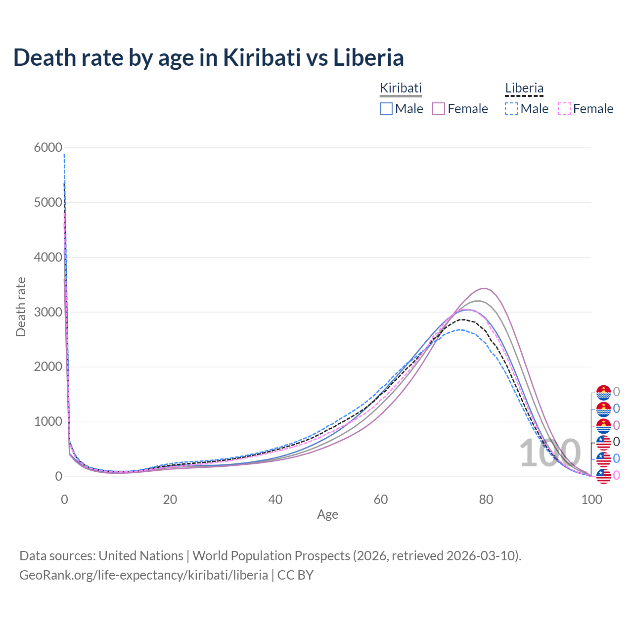 In Kiribati, the most common age of death is 0, compared to 0 in Liberia. The median age of death is 73.1 in Kiribati and 69.6 in Liberia, meaning only half of each cohort is expected to live past that age.