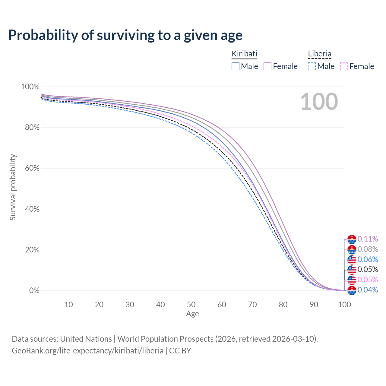 This life expectancy calculator shows the odds of living to 100, 95, 90, and below based on current age for both males and females in Kiribati and Liberia, along with mean and median age of death. The calculations are based on the 2026 life tables (actuarial tables) from the UN World Population Prospects.