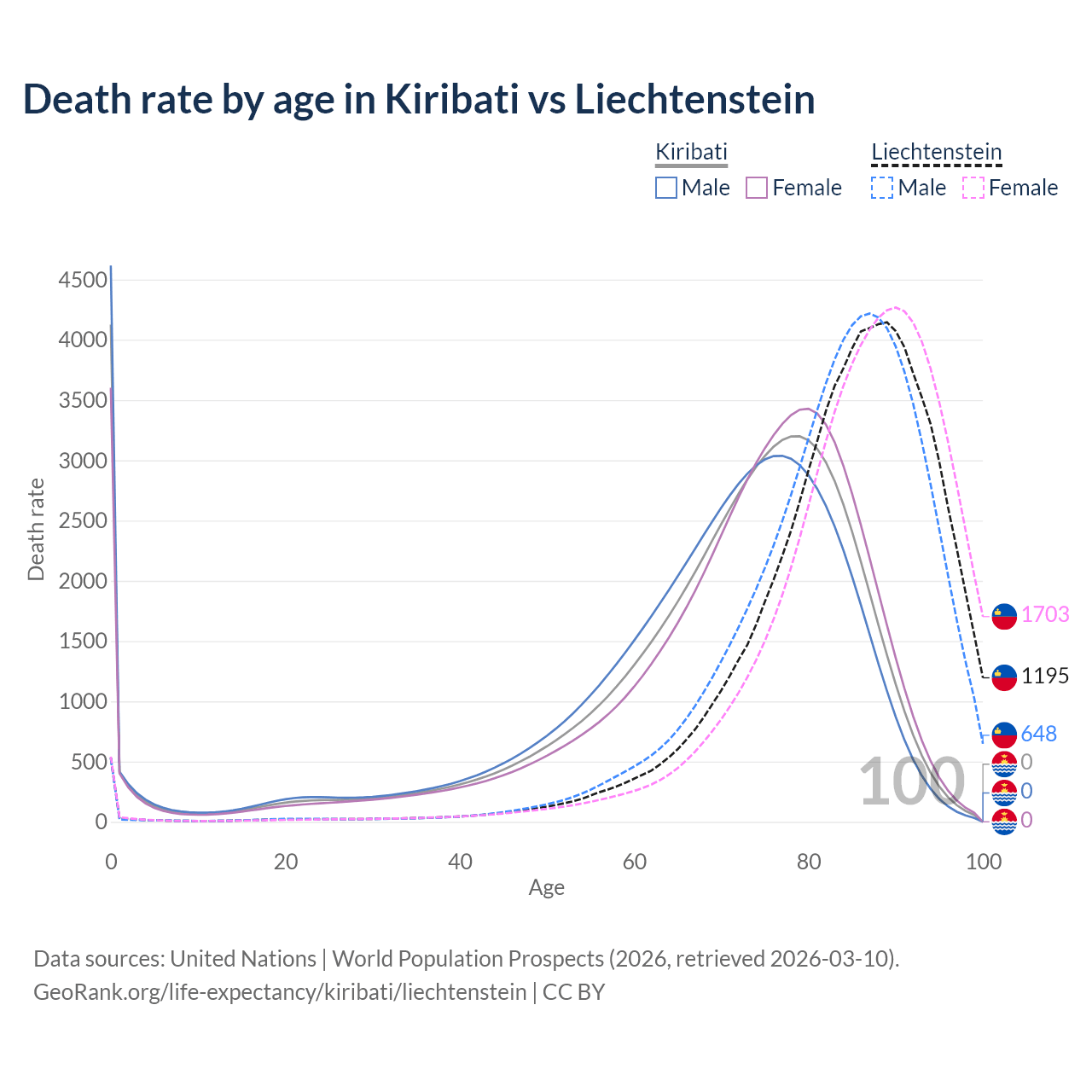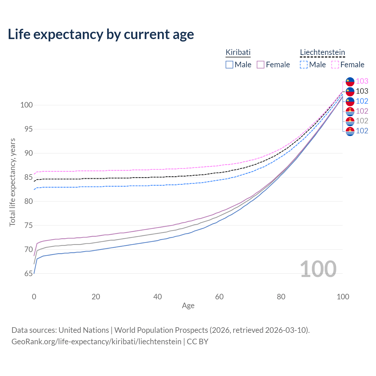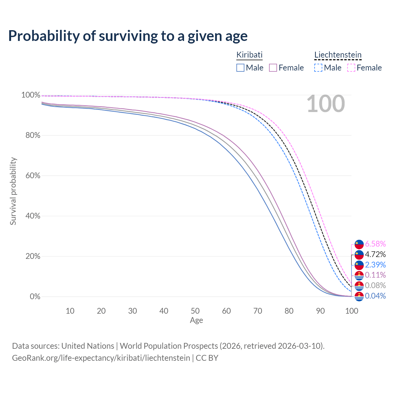 This life expectancy calculator shows the odds of living to 100, 95, 90, and below based on current age for both males and females in Kiribati and Liechtenstein, along with mean and median age of death. The calculations are based on the 2026 life tables (actuarial tables) from the UN World Population Prospects.