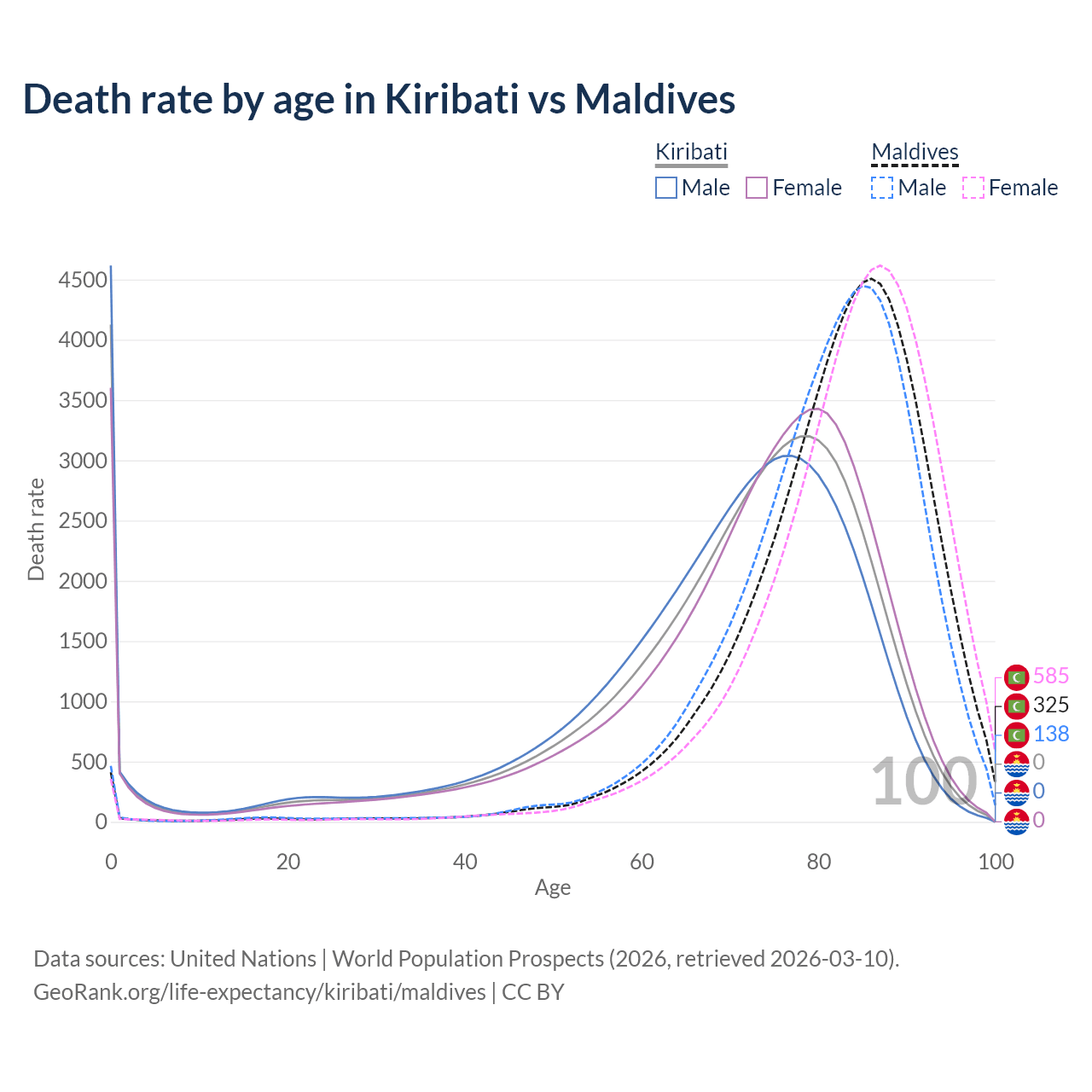 In Kiribati, the most common age of death is 0, compared to 86 in Maldives. The median age of death is 73.1 in Kiribati and 83.8 in Maldives, meaning only half of each cohort is expected to live past that age.