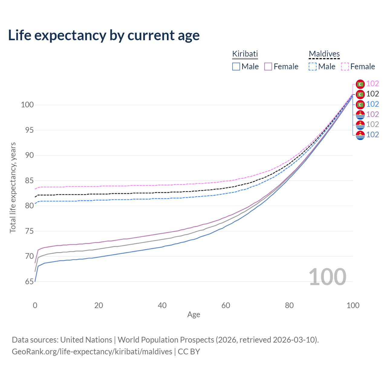 This life expectancy calculator shows the odds of living to 100, 95, 90, and below based on current age for both males and females in Kiribati and Maldives, along with mean and median age of death. The calculations are based on the 2026 life tables (actuarial tables) from the UN World Population Prospects.