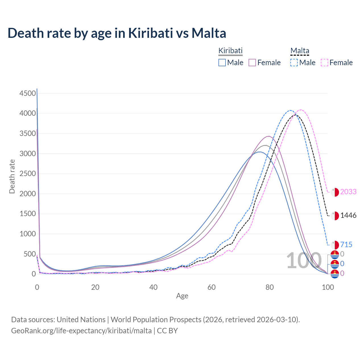 This life expectancy calculator shows the odds of living to 100, 95, 90, and below based on current age for both males and females in Kiribati and Malta, along with mean and median age of death. The calculations are based on the 2026 life tables (actuarial tables) from the UN World Population Prospects.