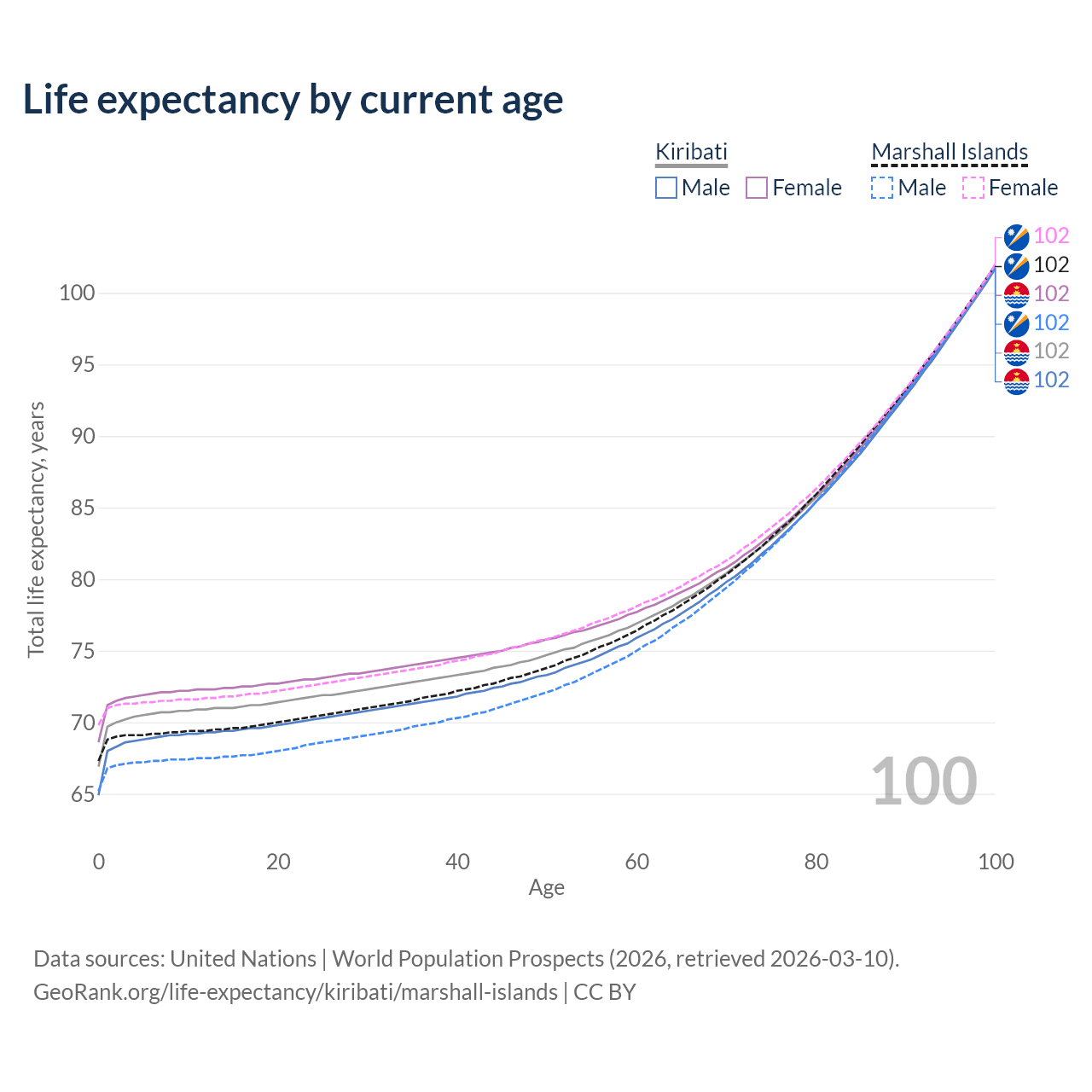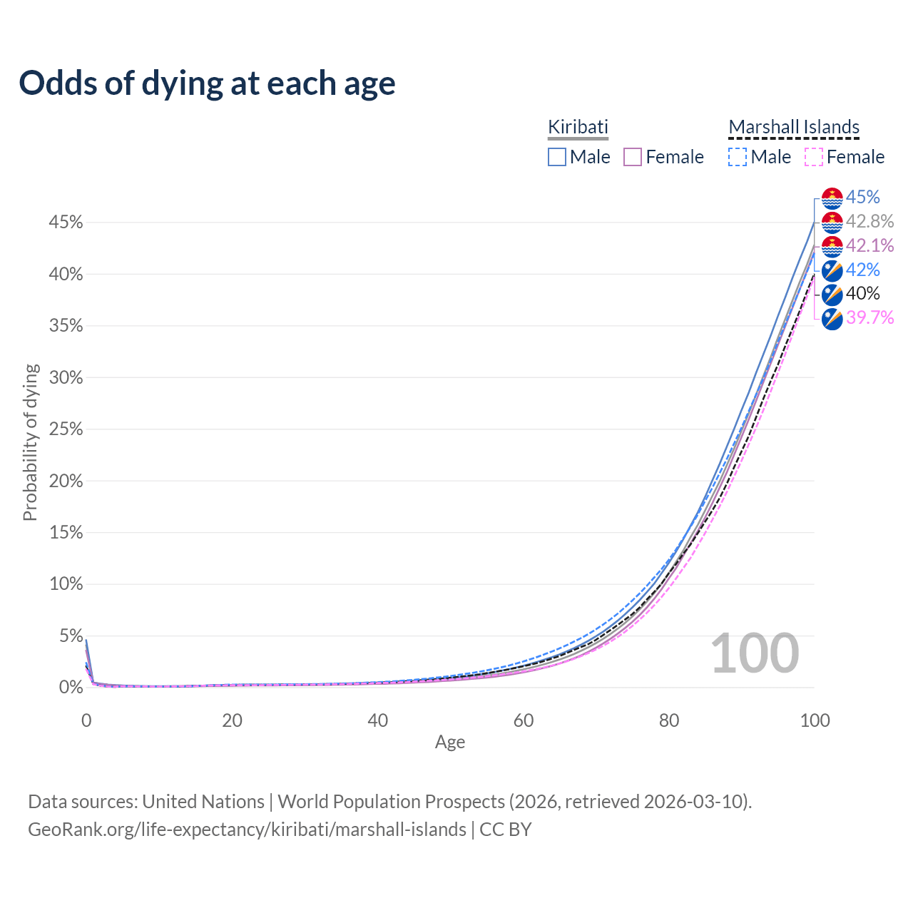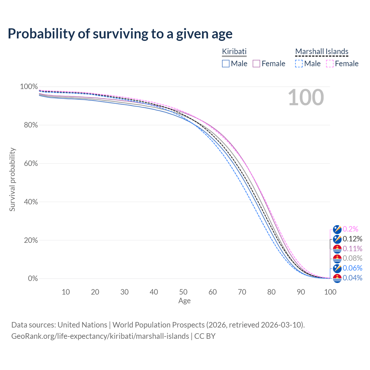 This life expectancy calculator shows the odds of living to 100, 95, 90, and below based on current age for both males and females in Kiribati and the Marshall Islands, along with mean and median age of death. The calculations are based on the 2026 life tables (actuarial tables) from the UN World Population Prospects.