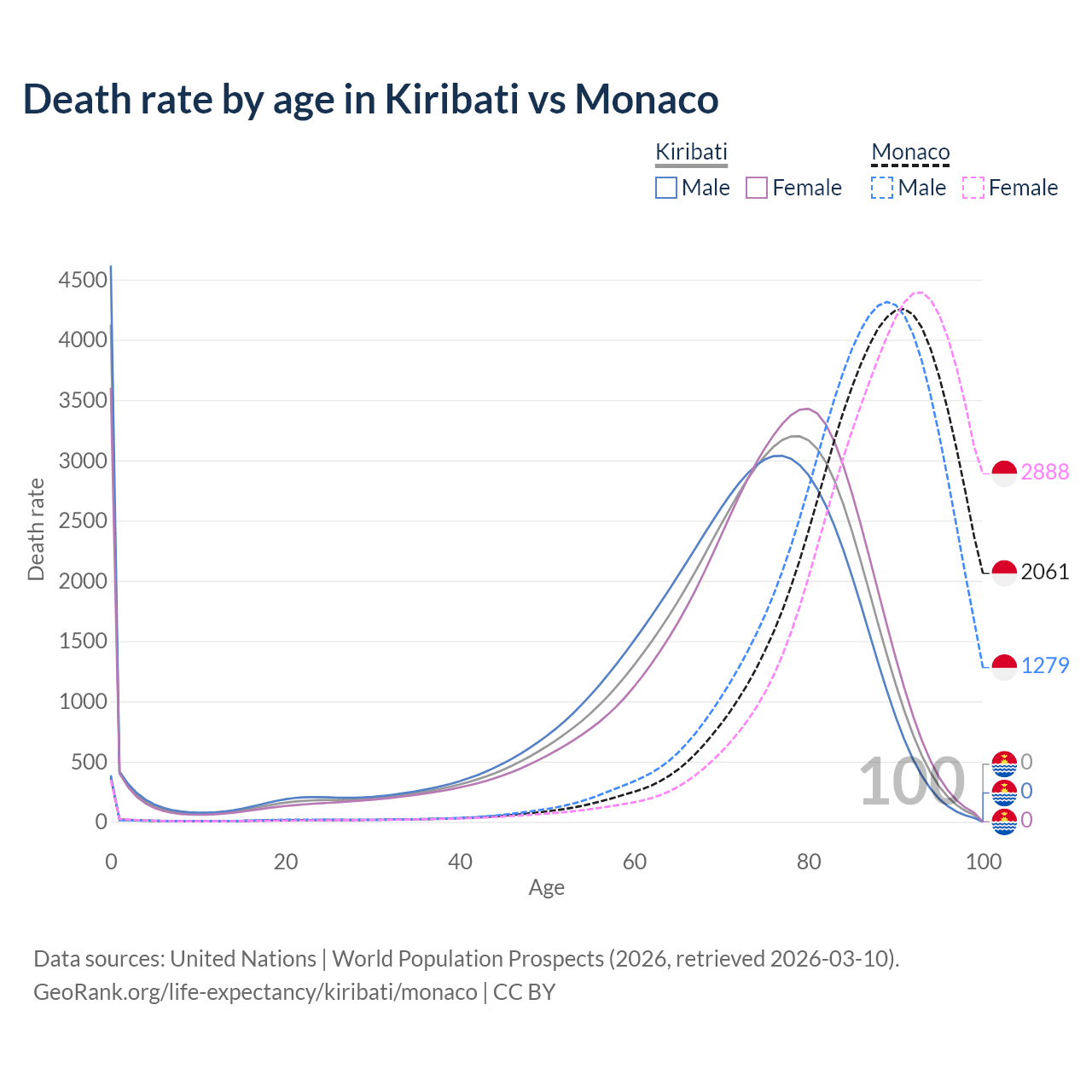 In Kiribati, the most common age of death is 0, compared to 91 in Monaco. The median age of death is 73.1 in Kiribati and 88.7 in Monaco, meaning only half of each cohort is expected to live past that age.