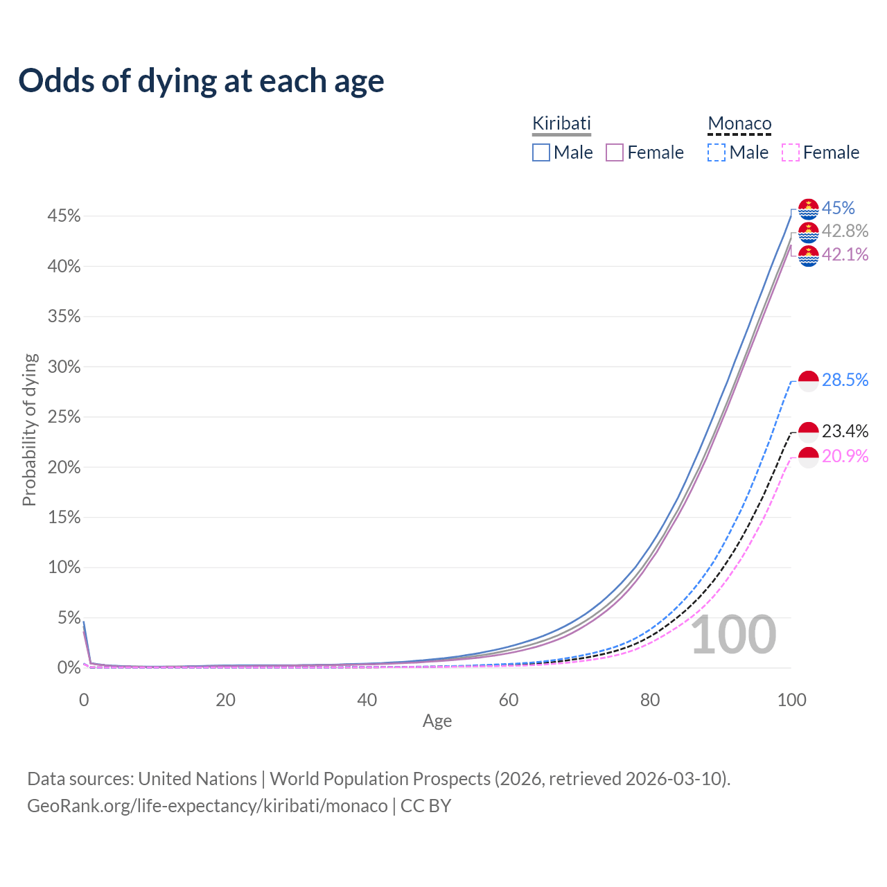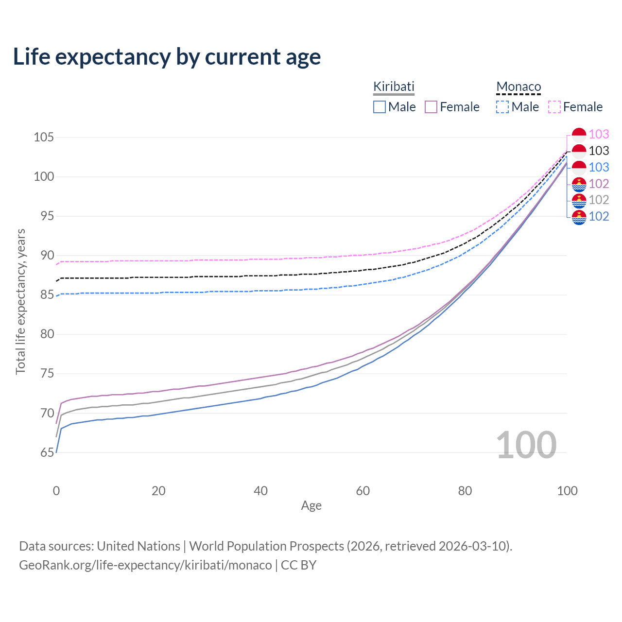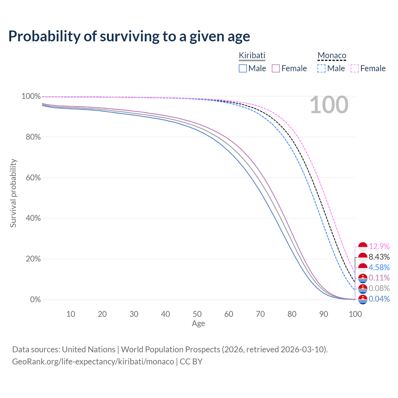 This life expectancy calculator shows the odds of living to 100, 95, 90, and below based on current age for both males and females in Kiribati and Monaco, along with mean and median age of death. The calculations are based on the 2026 life tables (actuarial tables) from the UN World Population Prospects.