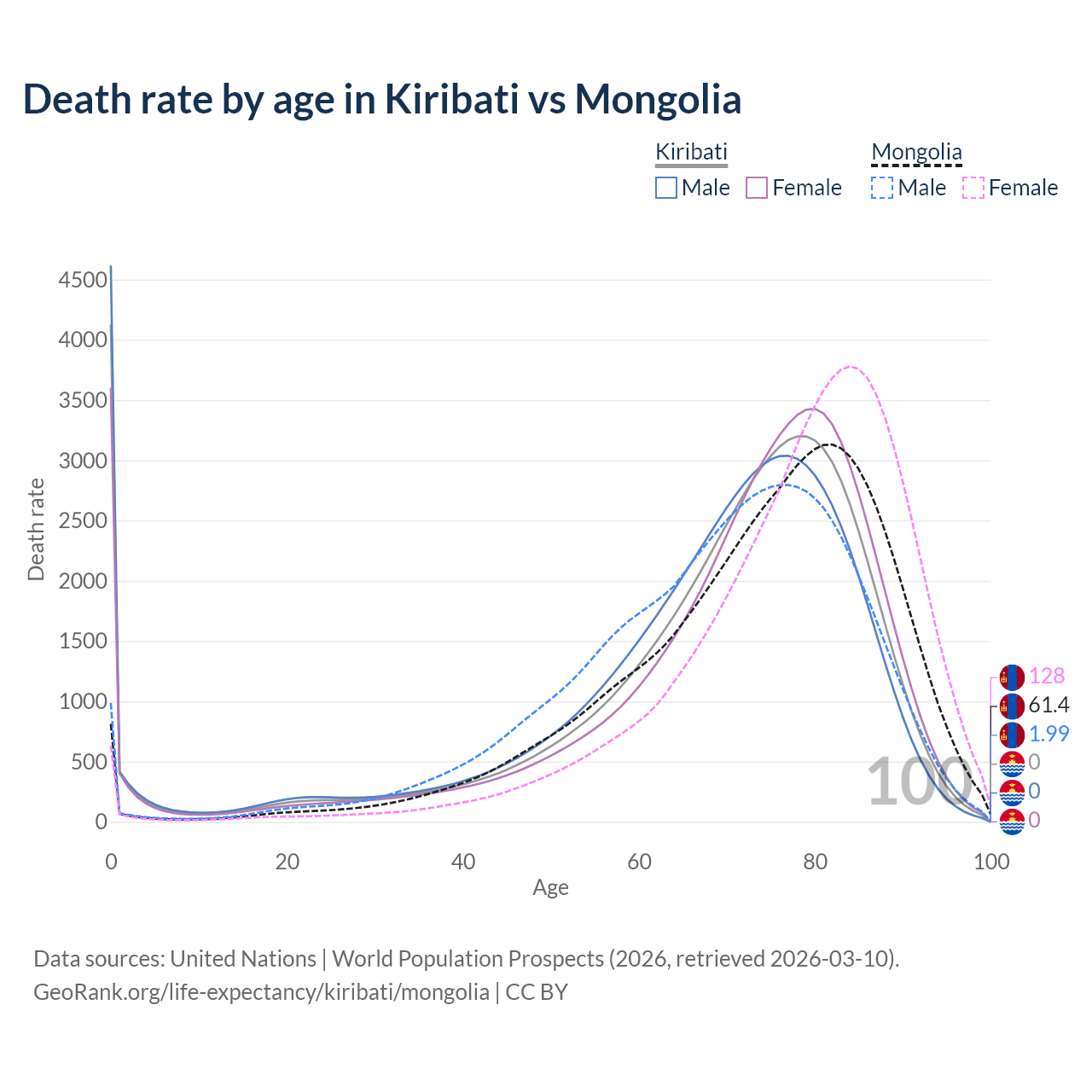 This life expectancy calculator shows the odds of living to 100, 95, 90, and below based on current age for both males and females in Kiribati and Mongolia, along with mean and median age of death. The calculations are based on the 2026 life tables (actuarial tables) from the UN World Population Prospects.