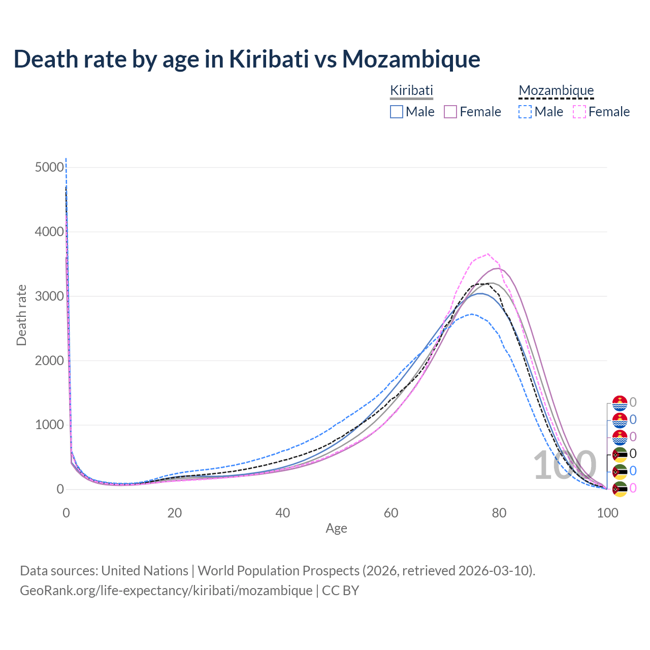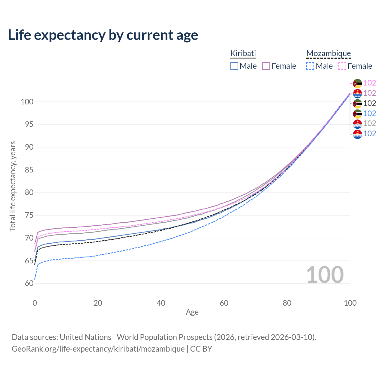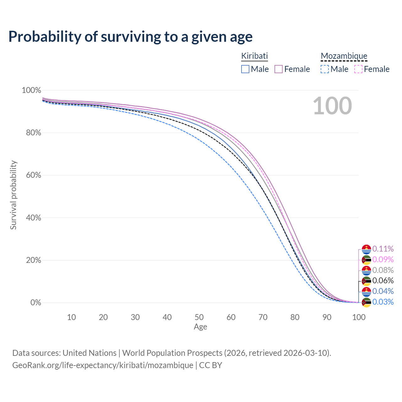 This life expectancy calculator shows the odds of living to 100, 95, 90, and below based on current age for both males and females in Kiribati and Mozambique, along with mean and median age of death. The calculations are based on the 2026 life tables (actuarial tables) from the UN World Population Prospects.
