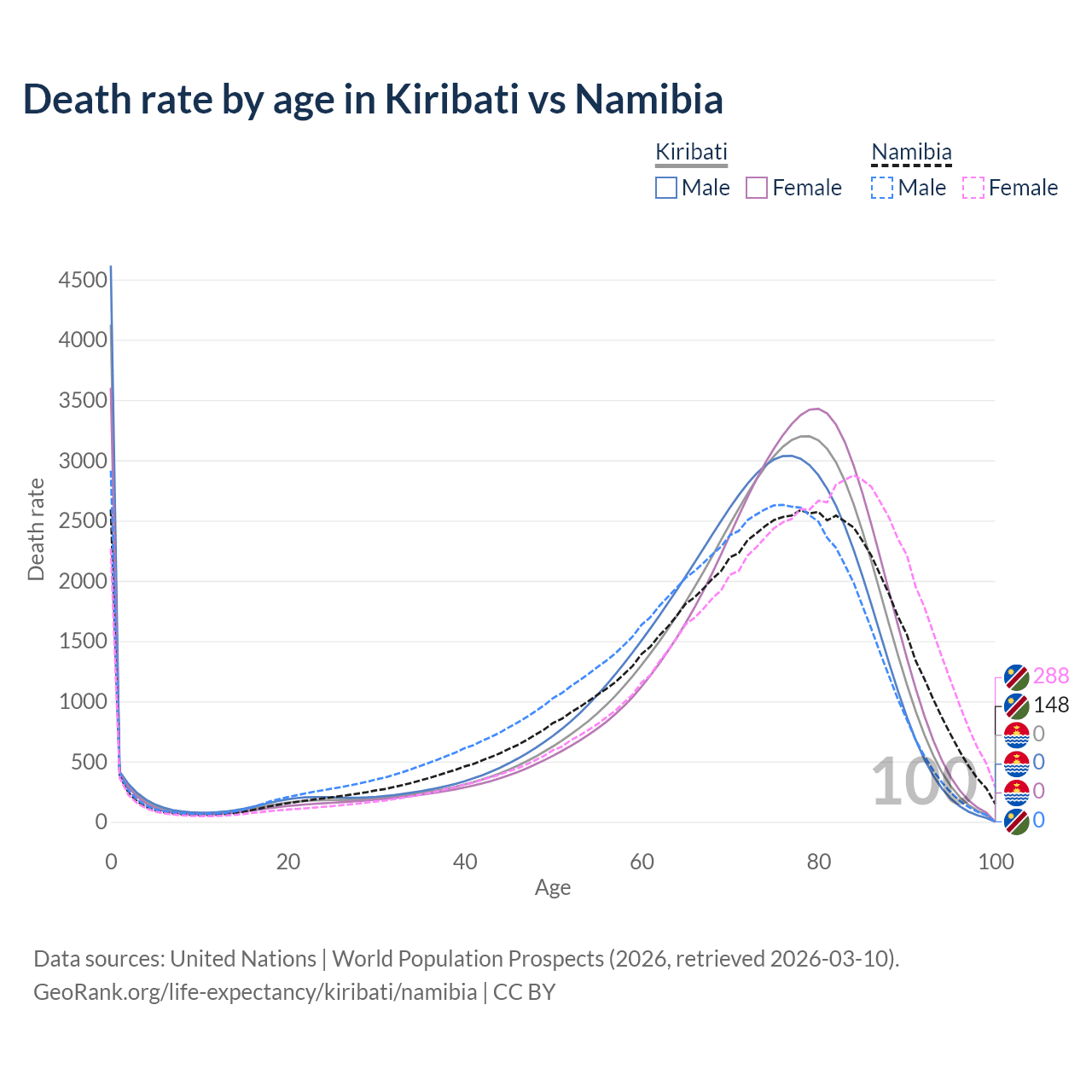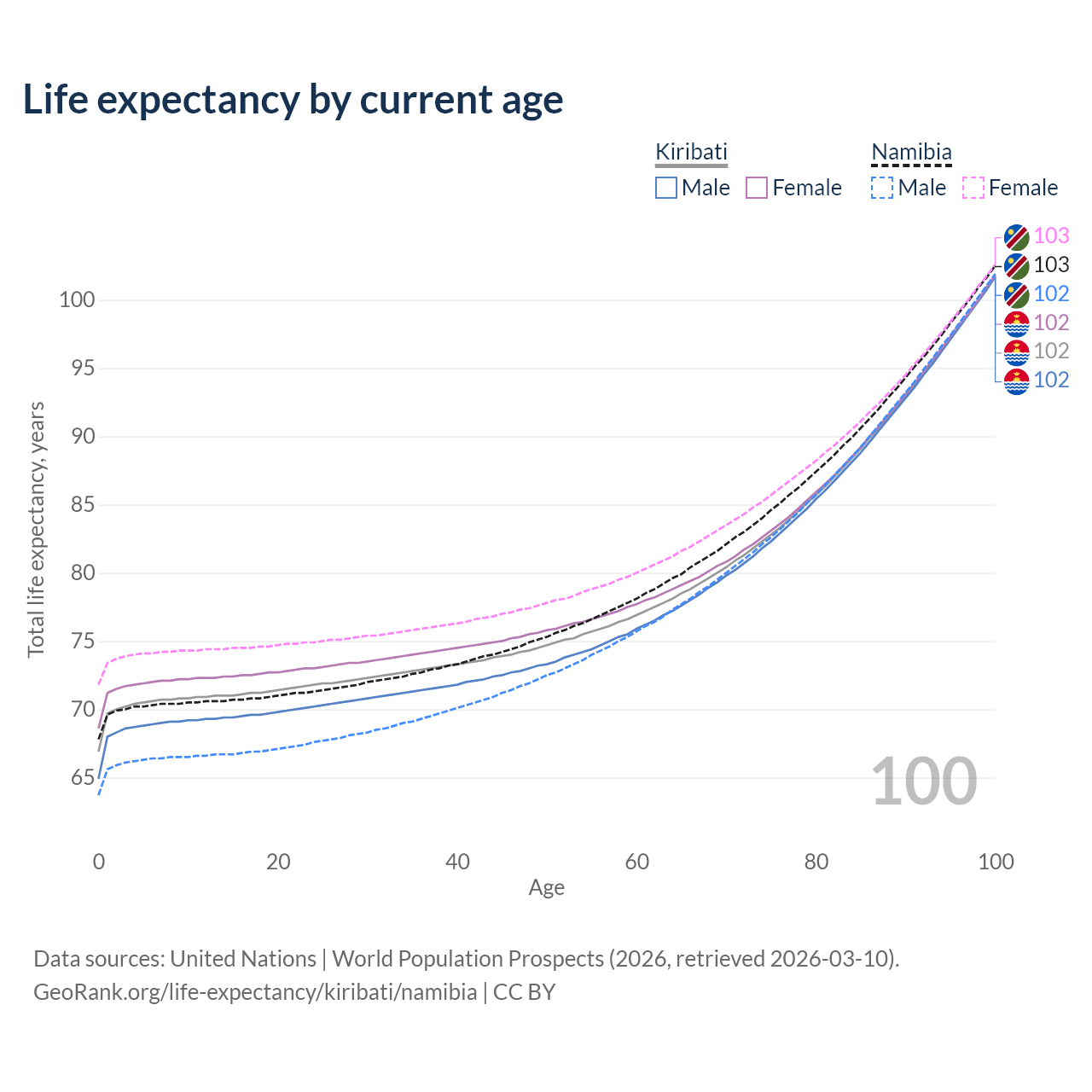 This life expectancy calculator shows the odds of living to 100, 95, 90, and below based on current age for both males and females in Kiribati and Namibia, along with mean and median age of death. The calculations are based on the 2026 life tables (actuarial tables) from the UN World Population Prospects.