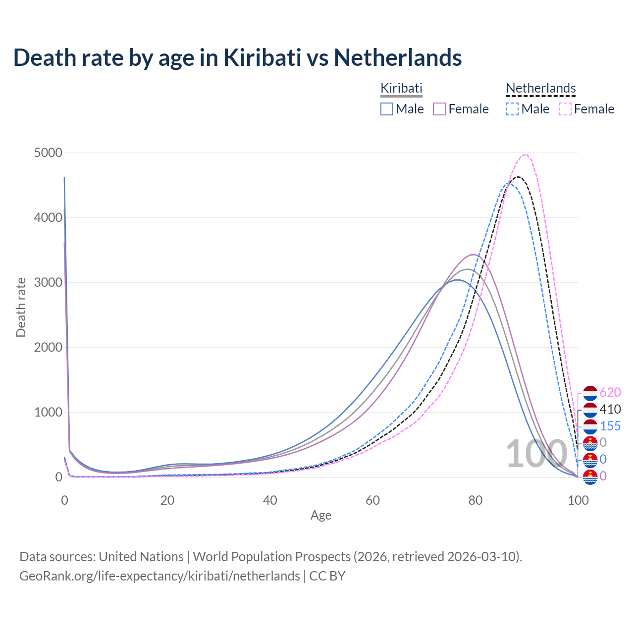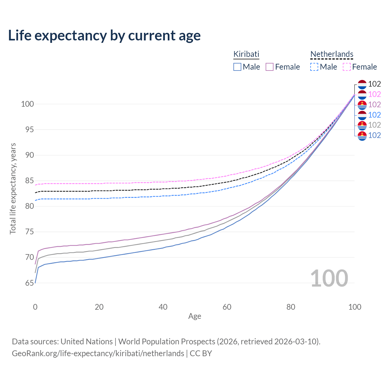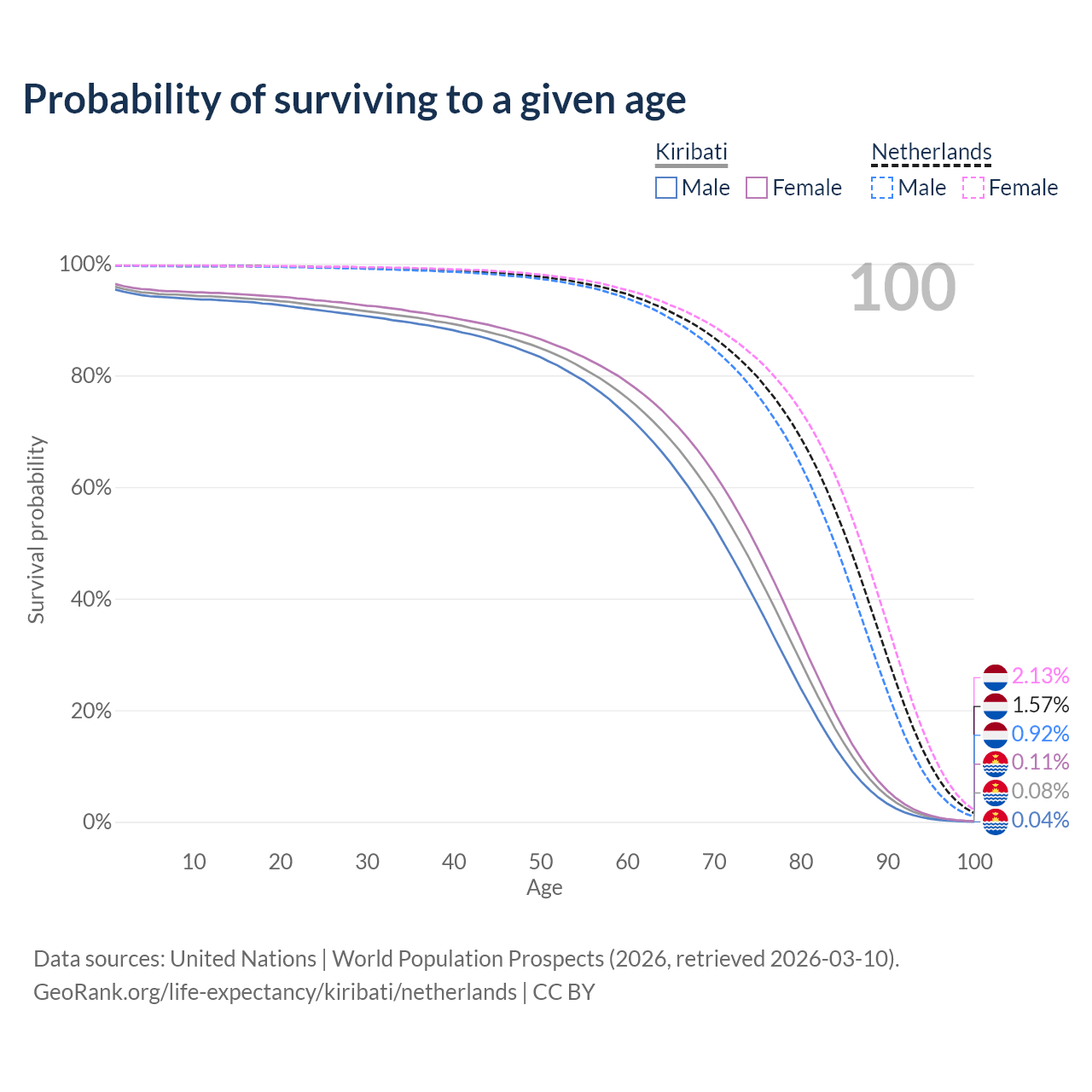 This life expectancy calculator shows the odds of living to 100, 95, 90, and below based on current age for both males and females in Kiribati and the Netherlands, along with mean and median age of death. The calculations are based on the 2026 life tables (actuarial tables) from the UN World Population Prospects.