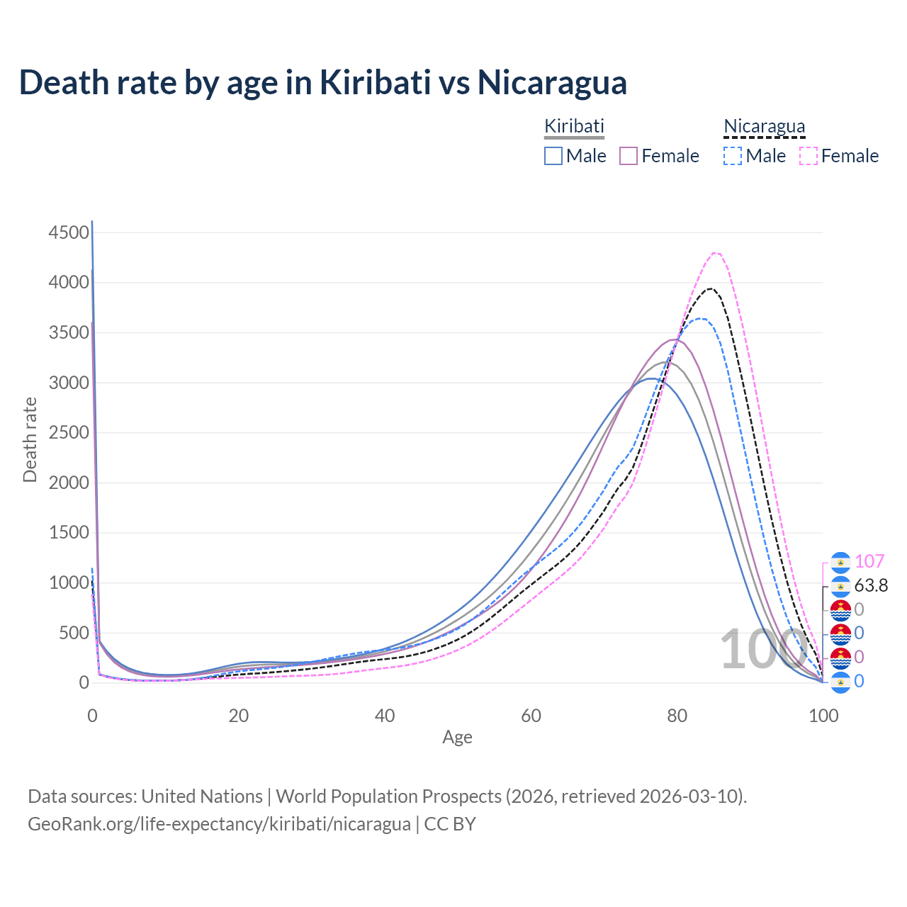 In Kiribati, the most common age of death is 0, compared to 85 in Nicaragua. The median age of death is 73.1 in Kiribati and 79.9 in Nicaragua, meaning only half of each cohort is expected to live past that age.