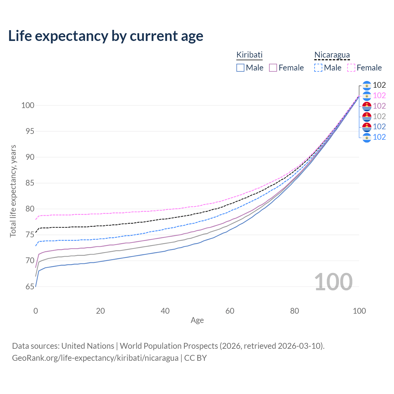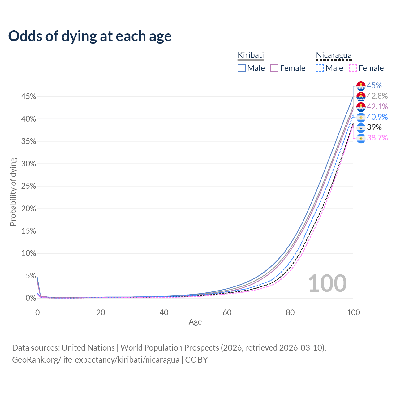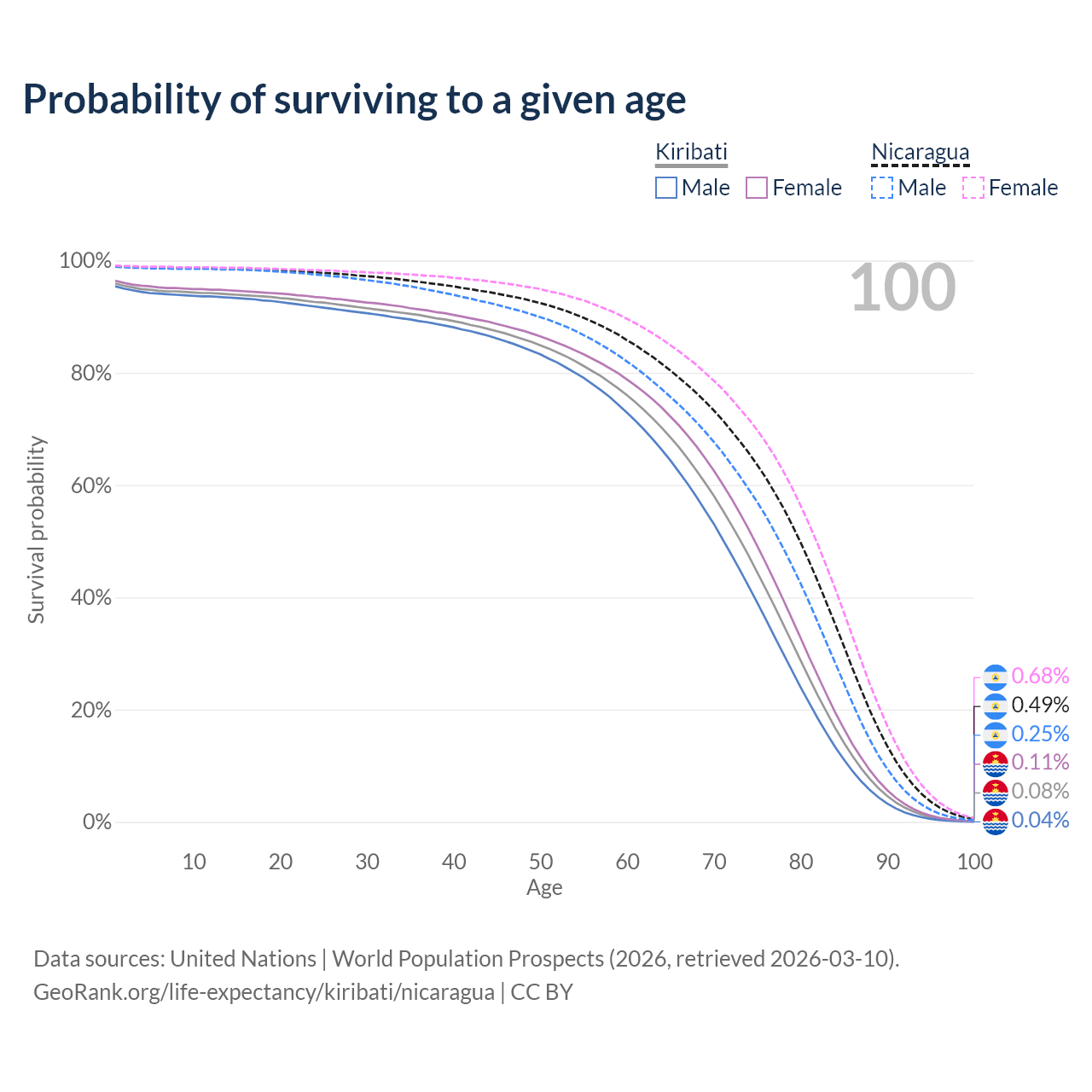 This life expectancy calculator shows the odds of living to 100, 95, 90, and below based on current age for both males and females in Kiribati and Nicaragua, along with mean and median age of death. The calculations are based on the 2026 life tables (actuarial tables) from the UN World Population Prospects.
