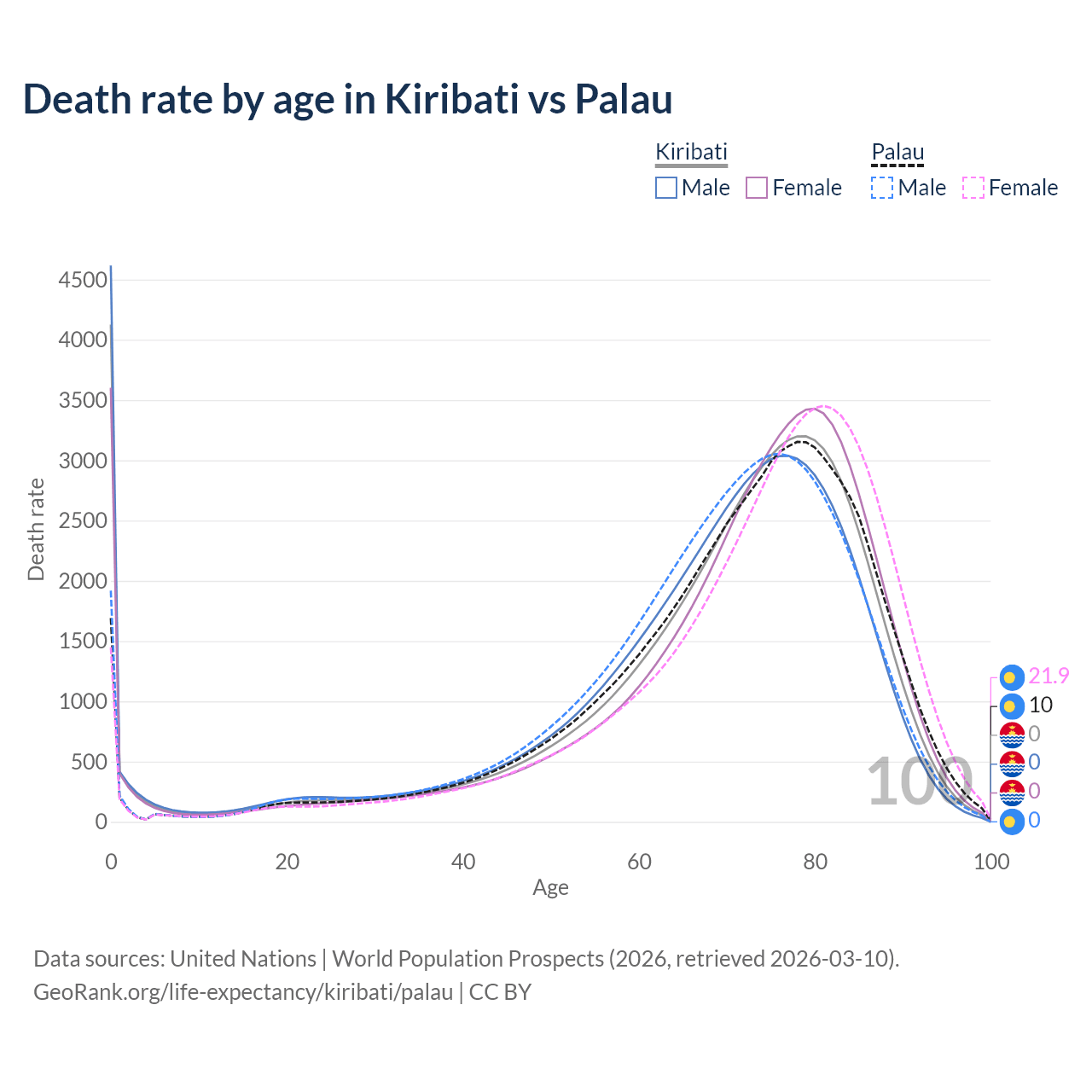 In Kiribati, the most common age of death is 0, compared to 78 in Palau. The median age of death is 73.1 in Kiribati and 73.8 in Palau, meaning only half of each cohort is expected to live past that age.