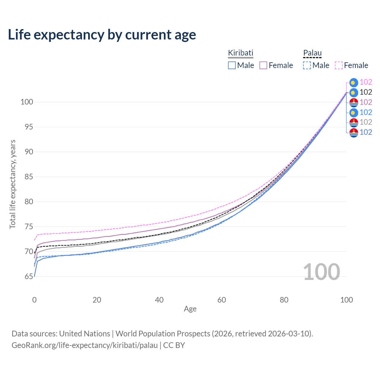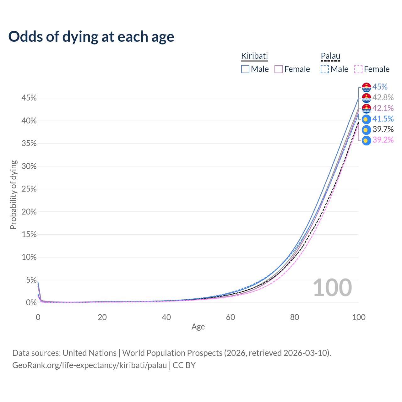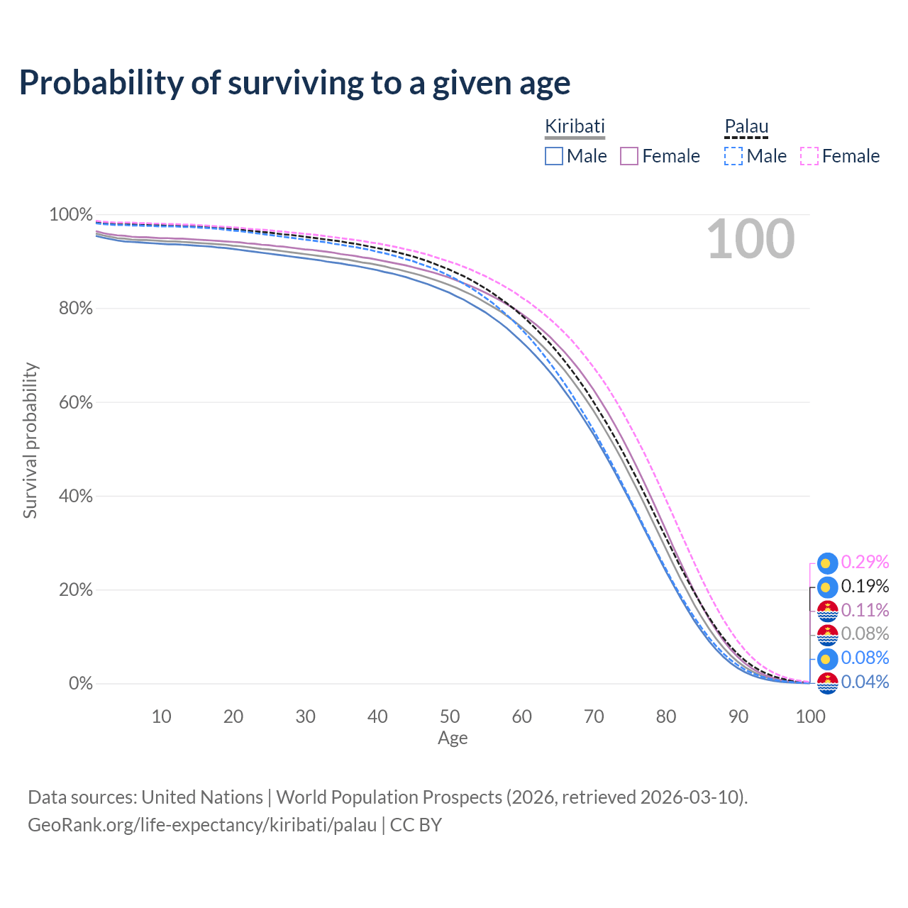 This life expectancy calculator shows the odds of living to 100, 95, 90, and below based on current age for both males and females in Kiribati and Palau, along with mean and median age of death. The calculations are based on the 2026 life tables (actuarial tables) from the UN World Population Prospects.