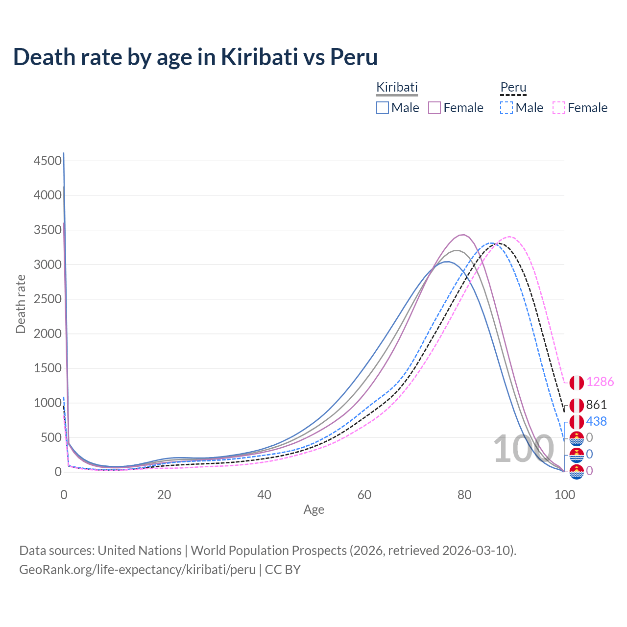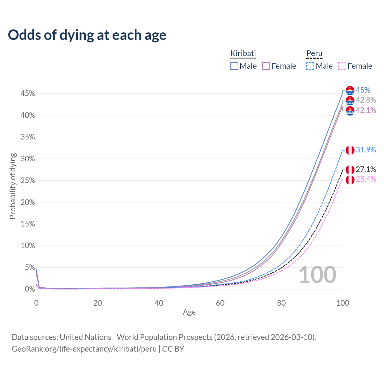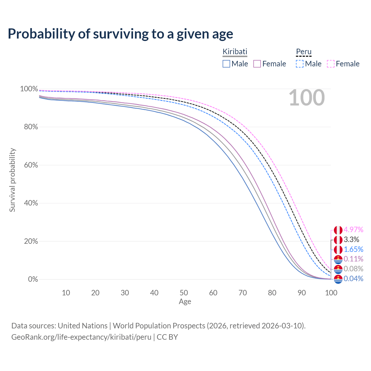 This life expectancy calculator shows the odds of living to 100, 95, 90, and below based on current age for both males and females in Kiribati and Peru, along with mean and median age of death. The calculations are based on the 2026 life tables (actuarial tables) from the UN World Population Prospects.
